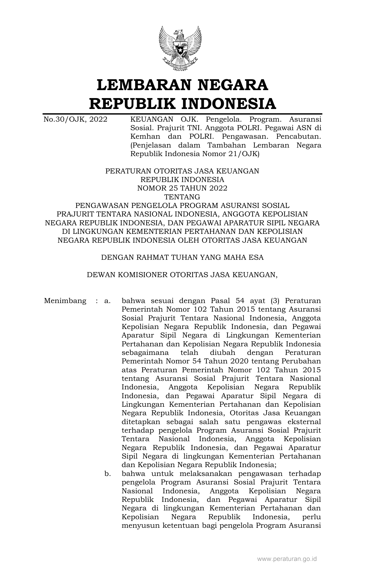 PERBAN Nomor 25 Tahun 2022 | Peraturan Badan Nomor 25 Tahun 2022 tentang PENGAWASAN PENGELOLA PROGRAM ASURANSI SOSIAL PRAJURIT TENTARA NASIONAL INDONESIA, ANGGOTA KEPOLISIAN NEGARA REPUBLIK INDONESIA, DAN PEGAWAI APARATUR SIPIL NEGARA DI LINGKUNGAN KEMENTERIAN PERTAHANAN DAN KEPOLISIAN NEGARA REPUBLIK INDONESIA OLEH OTORITAS JASA KEUANGAN