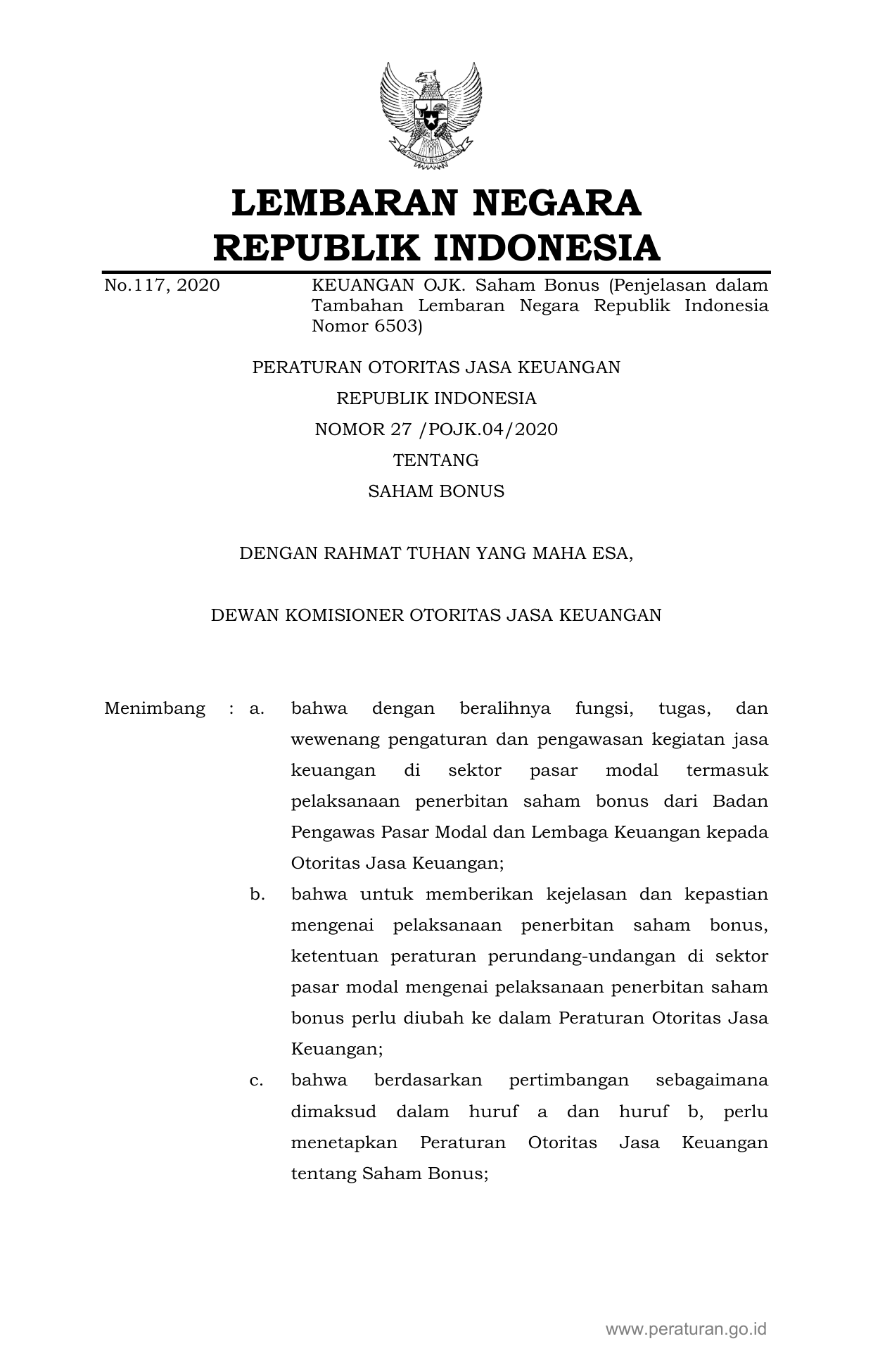 PERBAN Nomor 27-pojk-04-2020 Tahun 2020 | Peraturan Badan Nomor 27-pojk-04-2020 Tahun 2020 tentang SAHAM BONUS