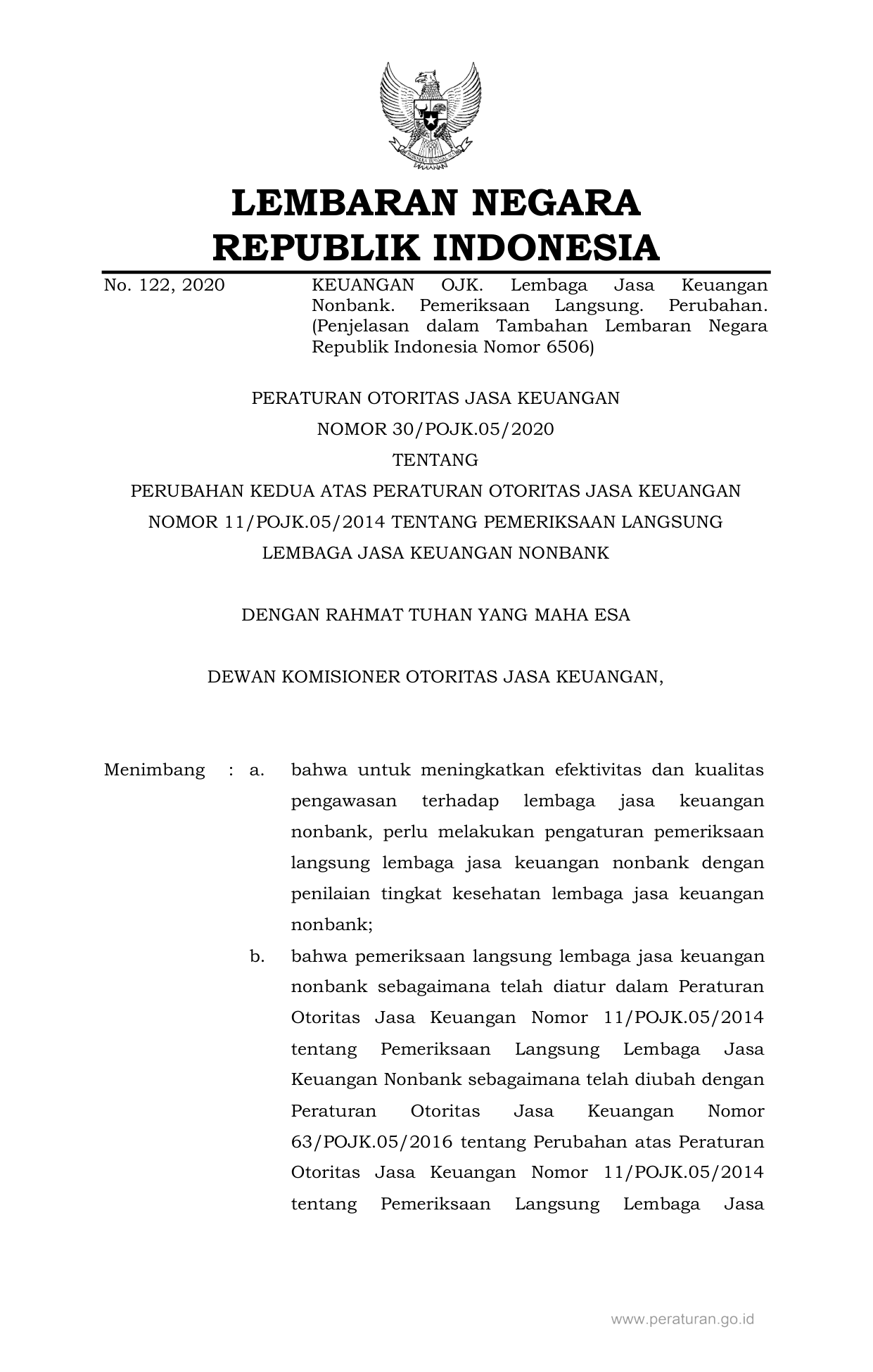 PERBAN Nomor 30-pojk-05-2020 Tahun 2020 | Peraturan Badan Nomor 30-pojk-05-2020 Tahun 2020 tentang PERUBAHAN KEDUA ATAS PERATURAN OTORITAS JASA KEUANGAN NOMOR 11/POJK.05/2014 TENTANG PEMERIKSAAN LANGSUNG LEMBAGA JASA KEUANGAN NONBANK