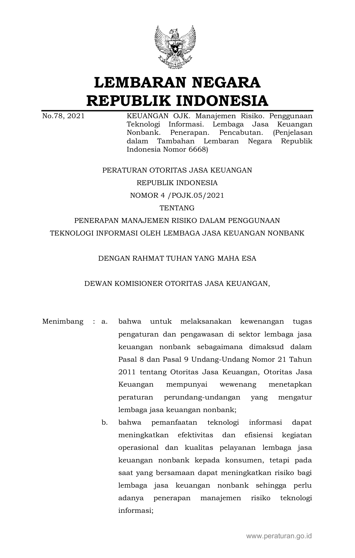 PERBAN Nomor 4-pojk-05-2021 Tahun 2021 | Peraturan Badan Nomor 4-pojk-05-2021 Tahun 2021 tentang PENERAPAN MANAJEMEN RISIKO DALAM PENGGUNAAN TEKNOLOGI INFORMASI OLEH LEMBAGA JASA KEUANGAN NONBANK