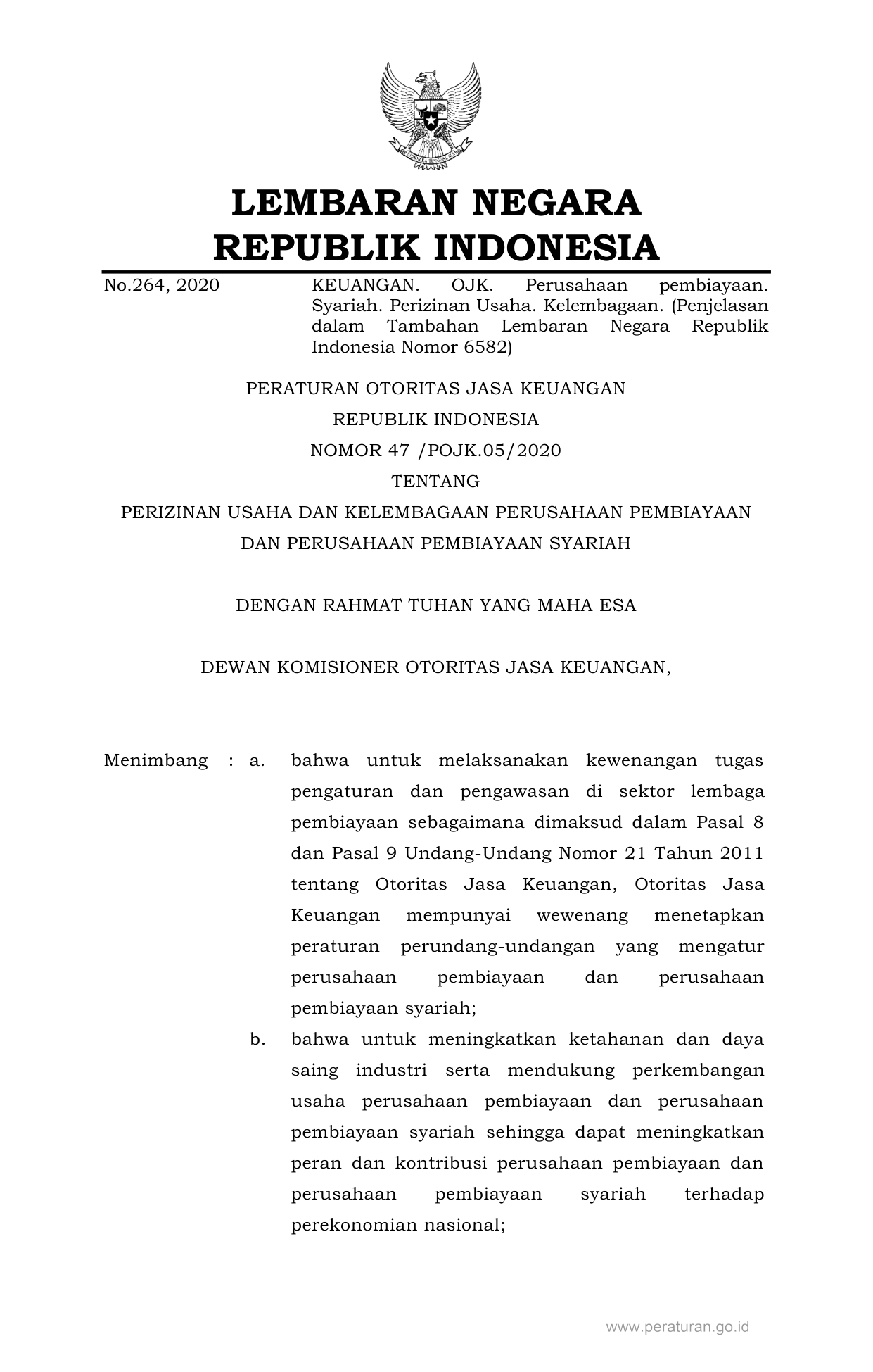 PERBAN Nomor 47-pojk-05-2020 Tahun 2020 | Peraturan Badan Nomor 47-pojk-05-2020 Tahun 2020 tentang PERIZINAN USAHA DAN KELEMBAGAAN PERUSAHAAN PEMBIAYAAN DAN PERUSAHAAN PEMBIAYAAN SYARIAH