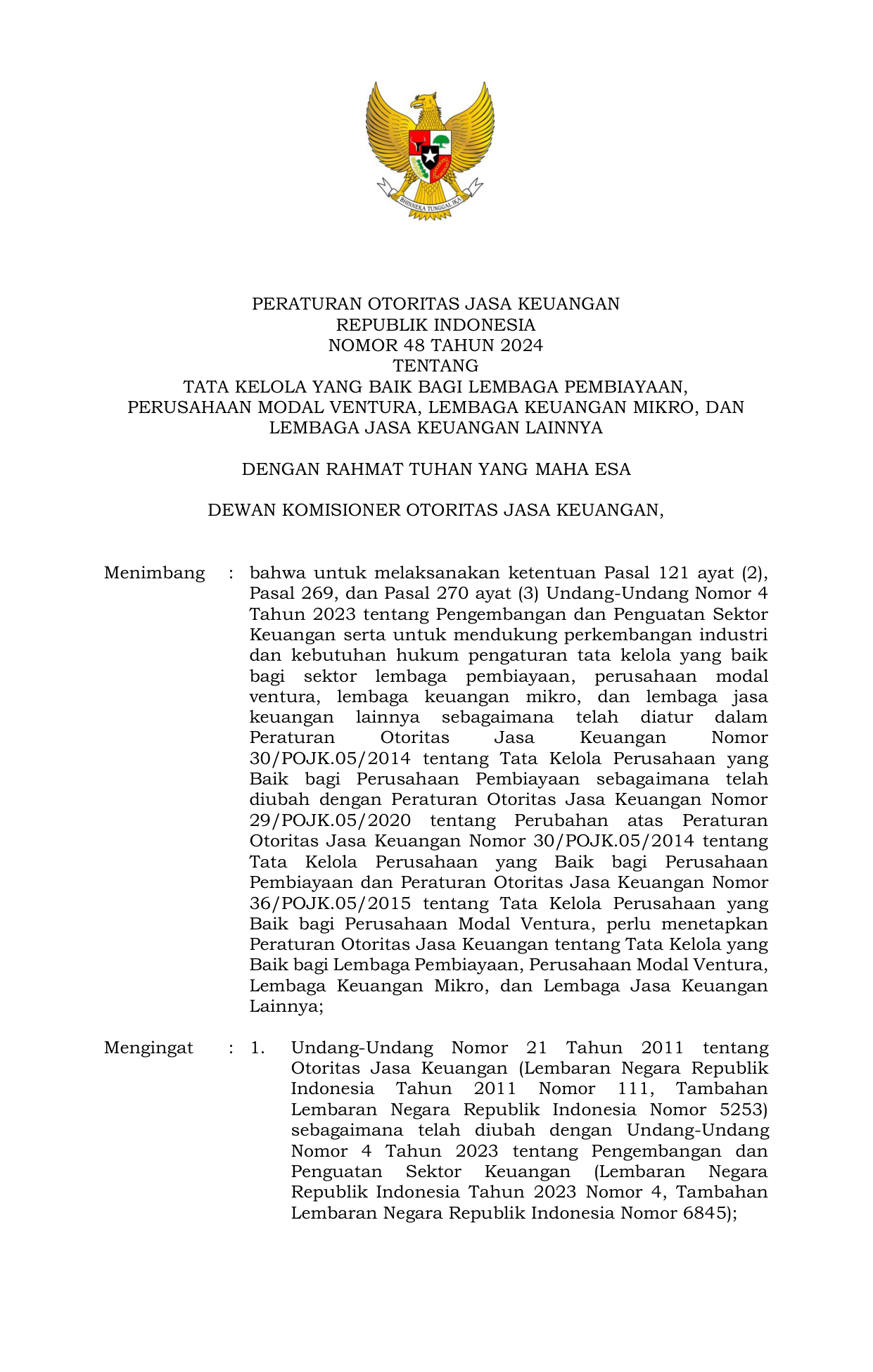 PERBAN Nomor 48 Tahun 2024 | Peraturan Badan Nomor 48 Tahun 2024 tentang Tata Kelola Yang Baik Bagi Lembaga Pembiayaan, Perusahaan Modal Ventura, Lembaga Keuangan Mikro, dan Lembaga Jasa Keuangan Lainnya