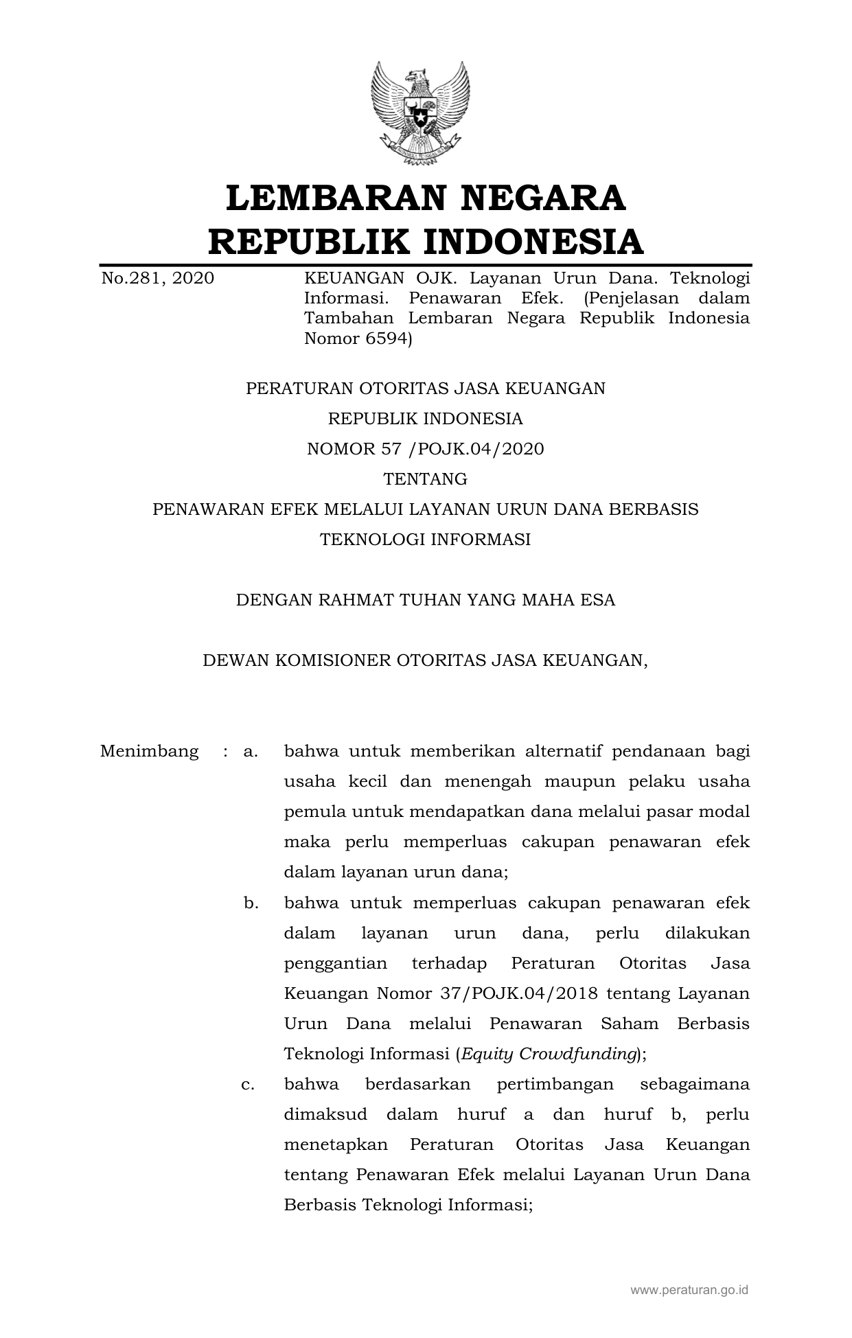 PERBAN Nomor 57-pojk-04-2020 Tahun 2020 | Peraturan Badan Nomor 57-pojk-04-2020 Tahun 2020 tentang PENAWARAN EFEK MELALUI LAYANAN URUN DANA BERBASIS TEKNOLOGI INFORMASI