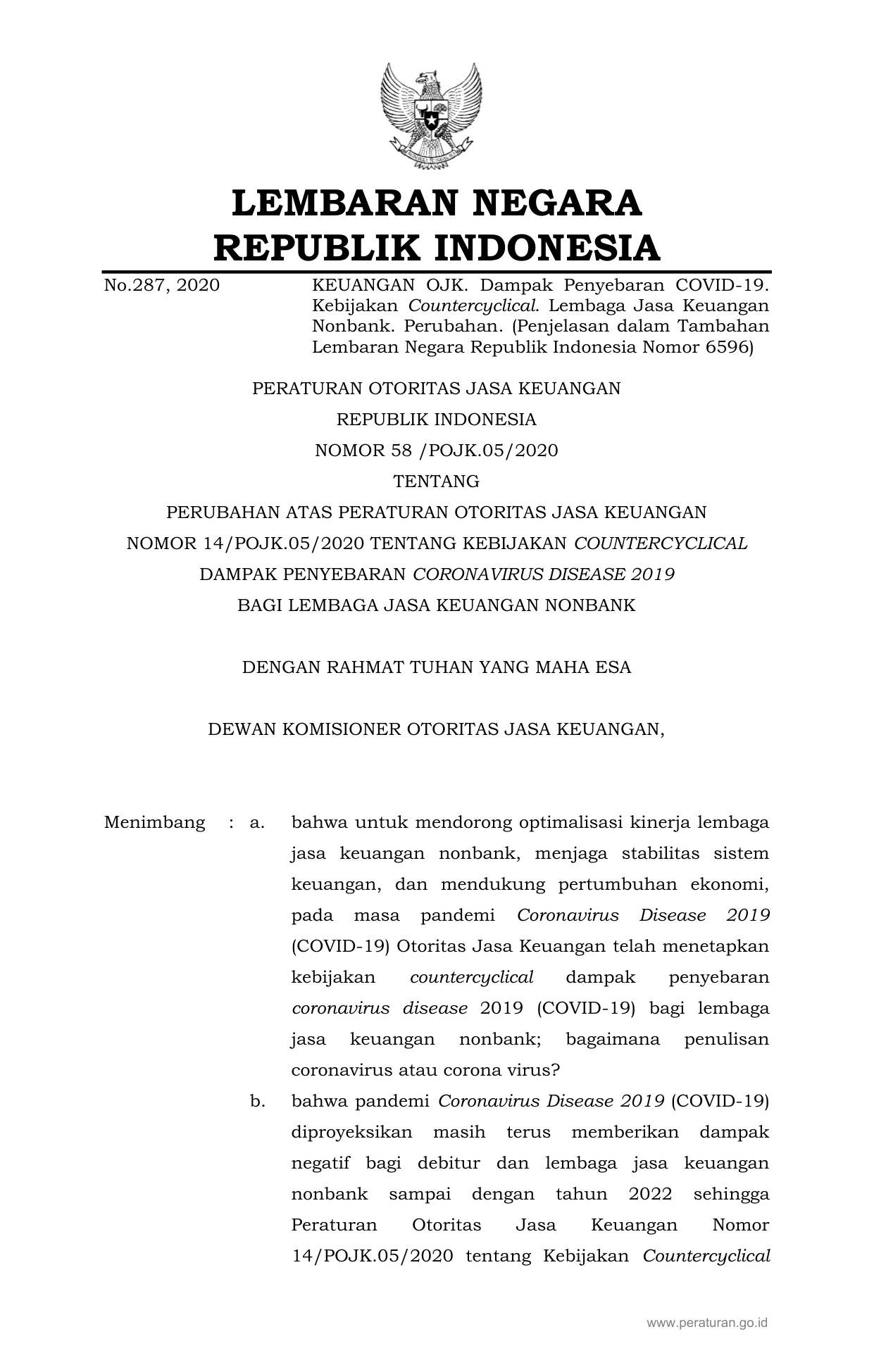 PERBAN Nomor 58-pojk-05-2020 Tahun 2020 | Peraturan Badan Nomor 58-pojk-05-2020 Tahun 2020 tentang PERUBAHAN ATAS PERATURAN OTORITAS JASA KEUANGAN NOMOR 14/POJK.05/2020 TENTANG KEBIJAKAN COUNTERCYCLICAL DAMPAK PENYEBARAN CORONAVIRUS DISEASE 2019 BAGI LEMBAGA JASA KEUANGAN NONBANK