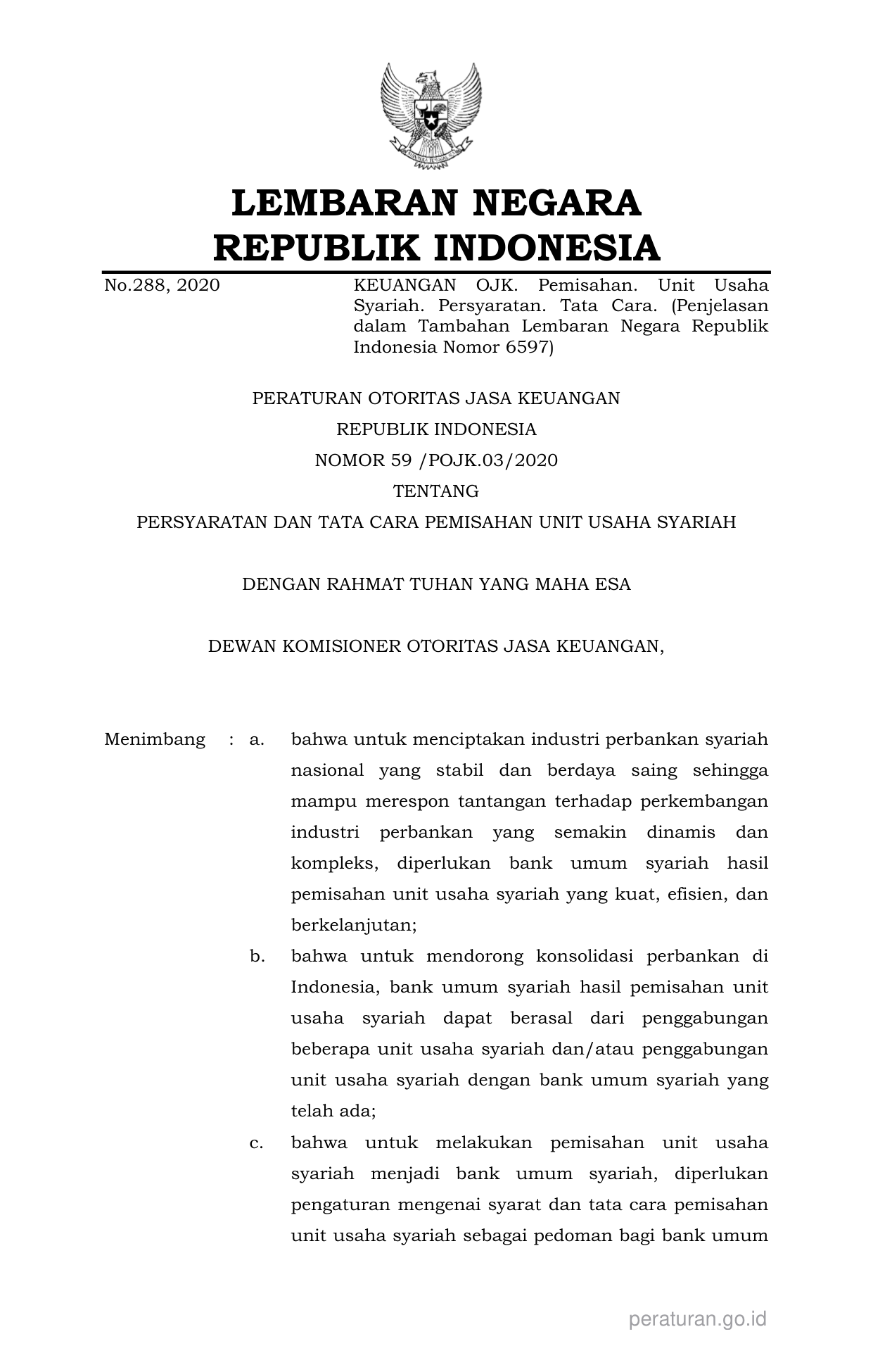 PERBAN Nomor 59-pojk-03-2020 Tahun 2020 | Peraturan Badan Nomor 59-pojk-03-2020 Tahun 2020 tentang PERSYARATAN DAN TATA CARA PEMISAHAN UNIT USAHA SYARIAH