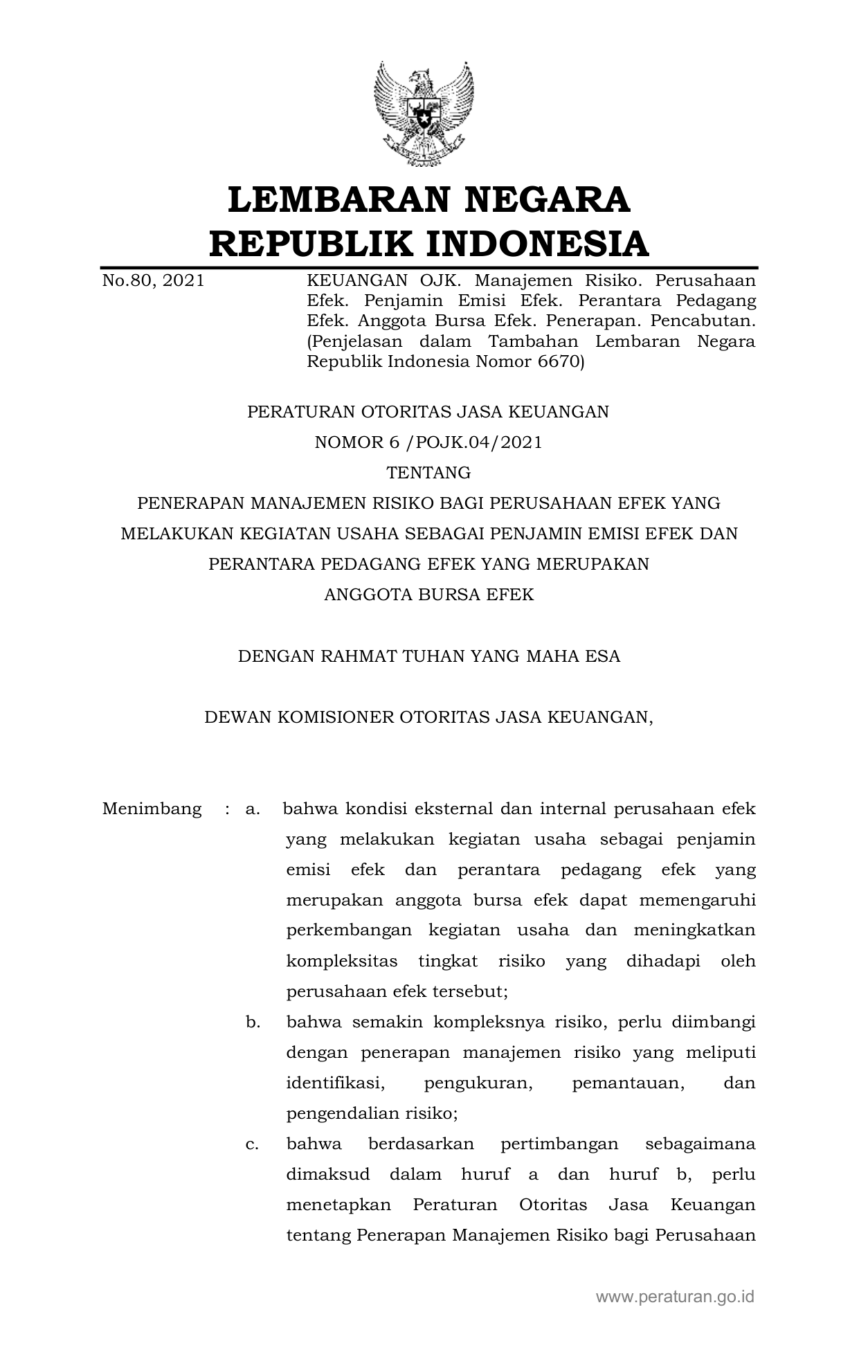 PERBAN Nomor 6-pojk-04-2021 Tahun 2021 | Peraturan Badan Nomor 6-pojk-04-2021 Tahun 2021 tentang PENERAPAN MANAJEMEN RISIKO BAGI PERUSAHAAN EFEK YANG MELAKUKAN KEGIATAN USAHA SEBAGAI PENJAMIN EMISI EFEK DAN PERANTARA PEDAGANG EFEK YANG MERUPAKAN ANGGOTA BURSA EFEK