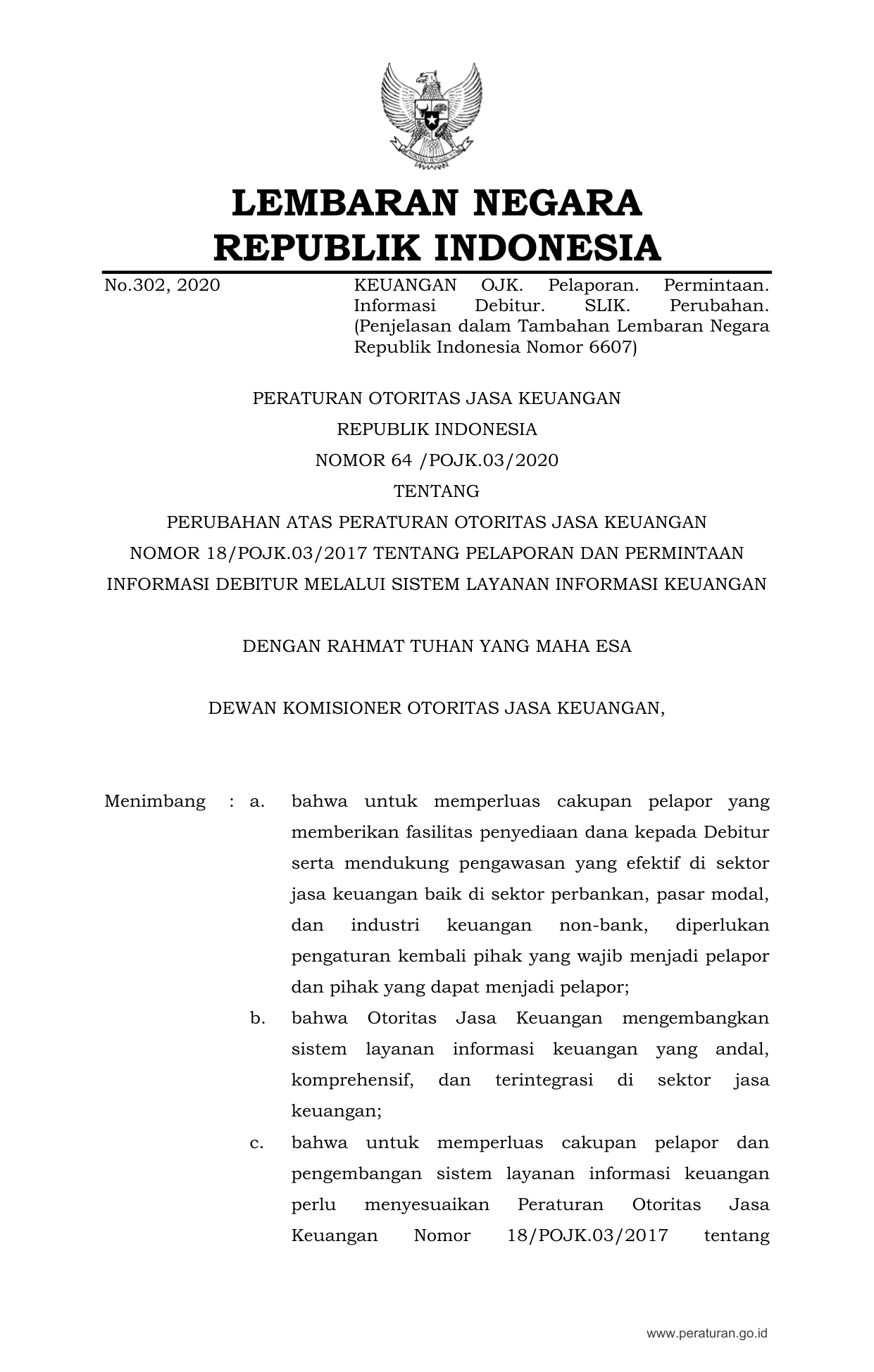 PERBAN Nomor 64-pojk-03-2020 Tahun 2020 | Peraturan Badan Nomor 64-pojk-03-2020 Tahun 2020 tentang PERUBAHAN ATAS PERATURAN OTORITAS JASA KEUANGAN NOMOR 18/POJK.03/2017 TENTANG PELAPORAN DAN PERMINTAAN INFORMASI DEBITUR MELALUI SISTEM LAYANAN INFORMASI KEUANGAN