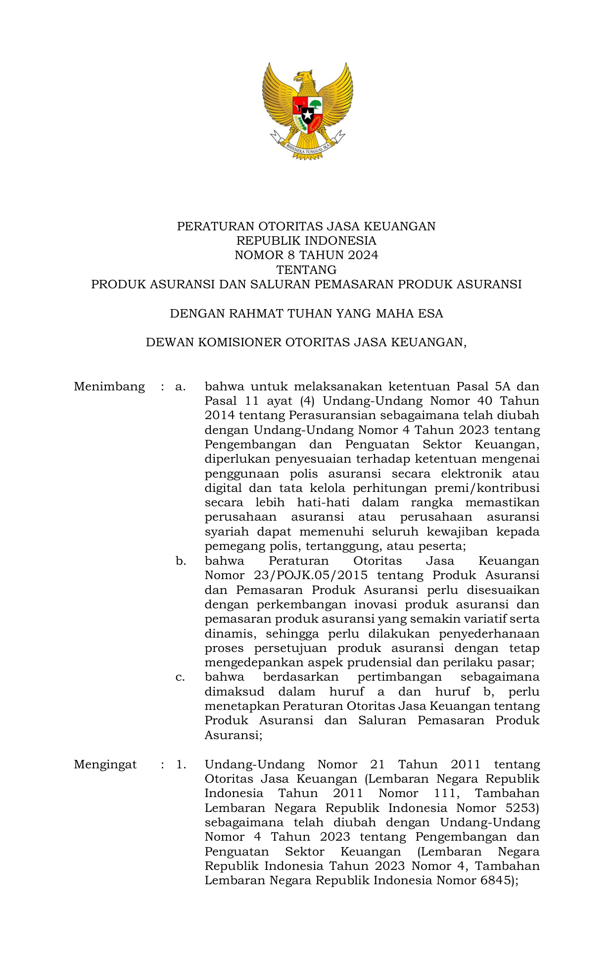 PERBAN Nomor 8 Tahun 2024 | Peraturan Badan Nomor 8 Tahun 2024 tentang PRODUK ASURANSI DAN SALURAN PEMASARAN PRODUK ASURANSI