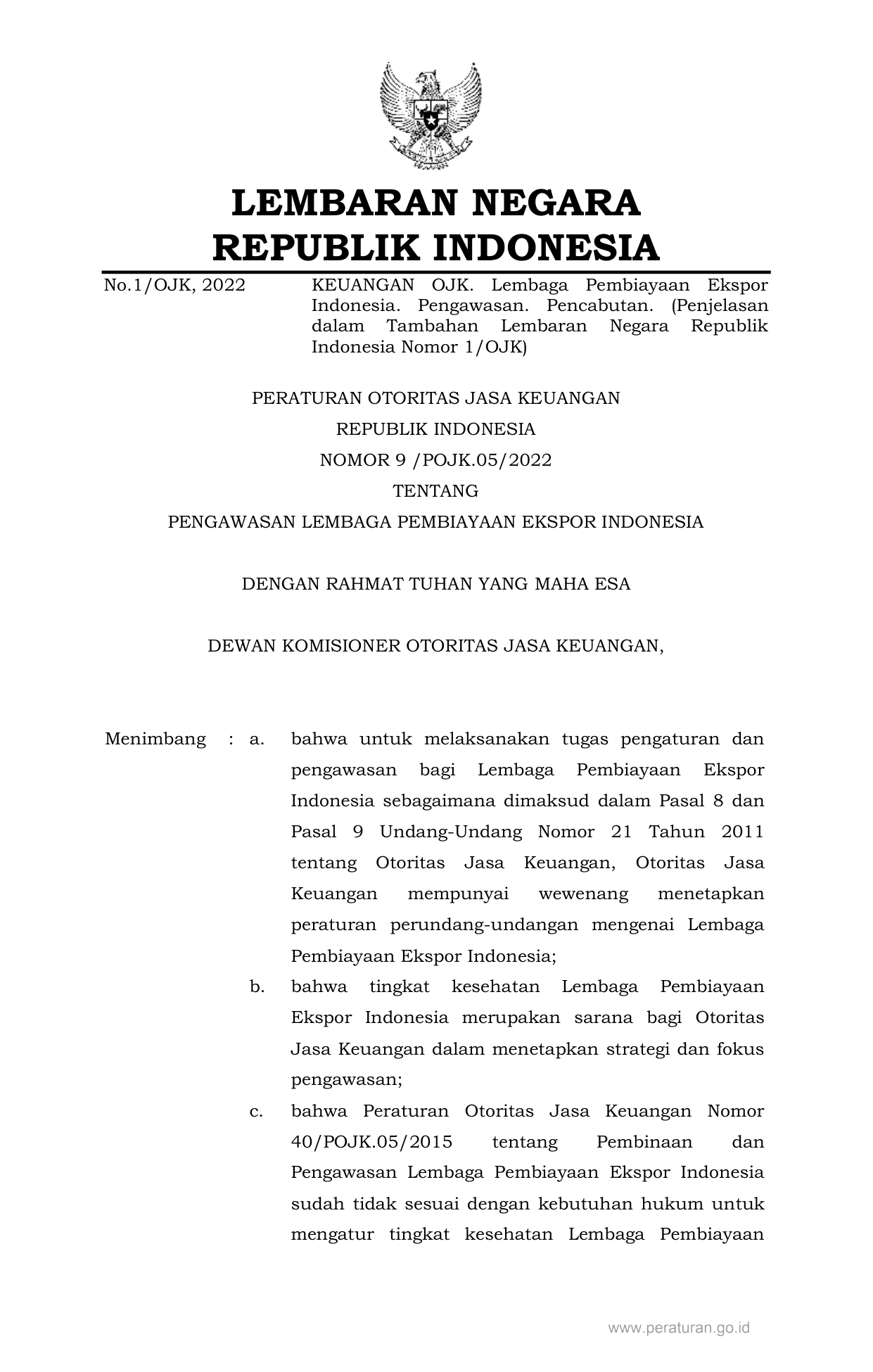 PERBAN Nomor 9-pojk-05-2022 Tahun 2022 | Peraturan Badan Nomor 9-pojk-05-2022 Tahun 2022 tentang PENGAWASAN LEMBAGA PEMBIAYAAN EKSPOR INDONESIA