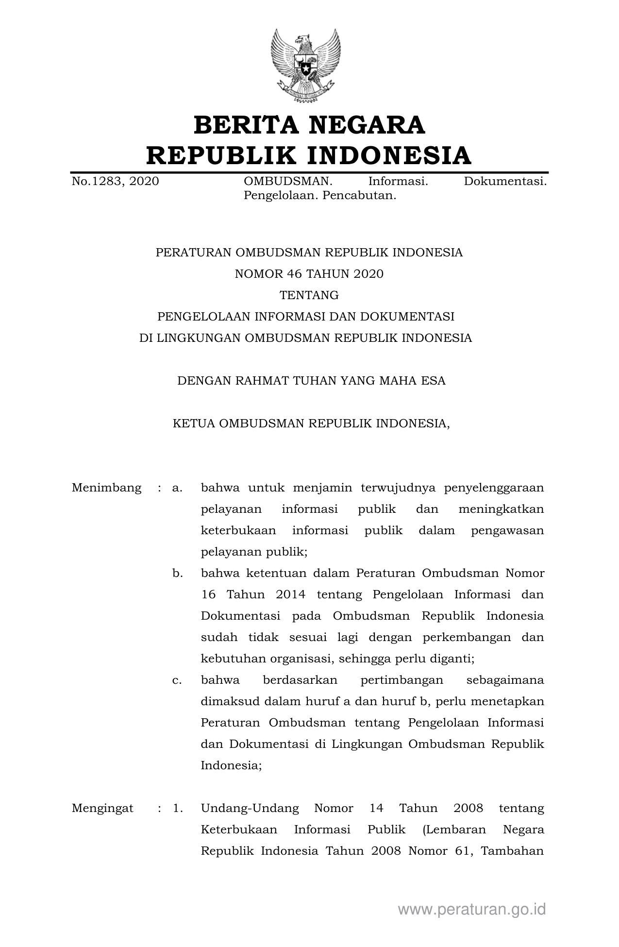 PERBAN Nomor 46 Tahun 2020 | Peraturan Badan Nomor 46 Tahun 2020 tentang PENGELOLAAN INFORMASI DAN DOKUMENTASI DI LINGKUNGAN OMBUDSMAN REPUBLIK INDONESIA