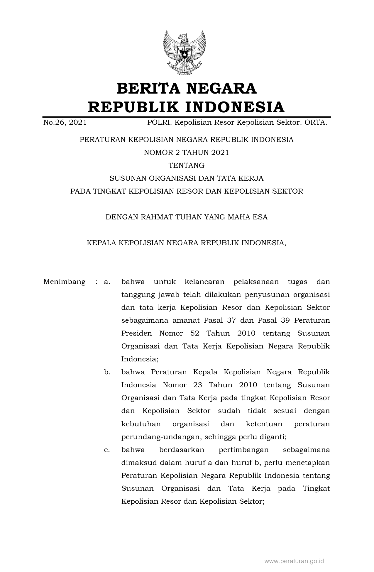 PERBAN Nomor 2 Tahun 2021 | Peraturan Badan Nomor 2 Tahun 2021 tentang SUSUNAN ORGANISASI DAN TATA KERJA PADA TINGKAT KEPOLISIAN RESOR DAN KEPOLISIAN SEKTOR