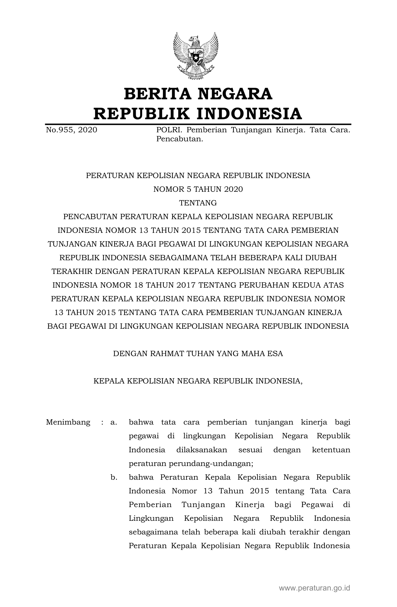 PERBAN Nomor 5 Tahun 2020 | Peraturan Badan Nomor 5 Tahun 2020 tentang PENCABUTAN PERATURAN KEPALA KEPOLISIAN NEGARA REPUBLIK INDONESIA NOMOR 13 TAHUN 2015 TENTANG TATA CARA PEMBERIAN TUNJANGAN KINERJA BAGI PEGAWAI DI LINGKUNGAN KEPOLISIAN NEGARA REPUBLIK INDONESIA SEBAGAIMANA TELAH BEBERAPA KALI DIUBAH TERAKHIR DENGAN PERATURAN KEPALA KEPOLISIAN NEGARA REPUBLIK INDONESIA NOMOR 18 TAHUN 2017 TENTANG PERUBAHAN KEDUA ATAS PERATURAN KEPALA KEPOLISIAN NEGARA REPUBLIK INDONESIA NOMOR 13 TAHUN 2015 TENTANG TATA CARA PEMBERIAN TUNJANGAN KINERJA BAGI PEGAWAI DI LINGKUNGAN KEPOLISIAN NEGARA REPUBLIK INDONESIA