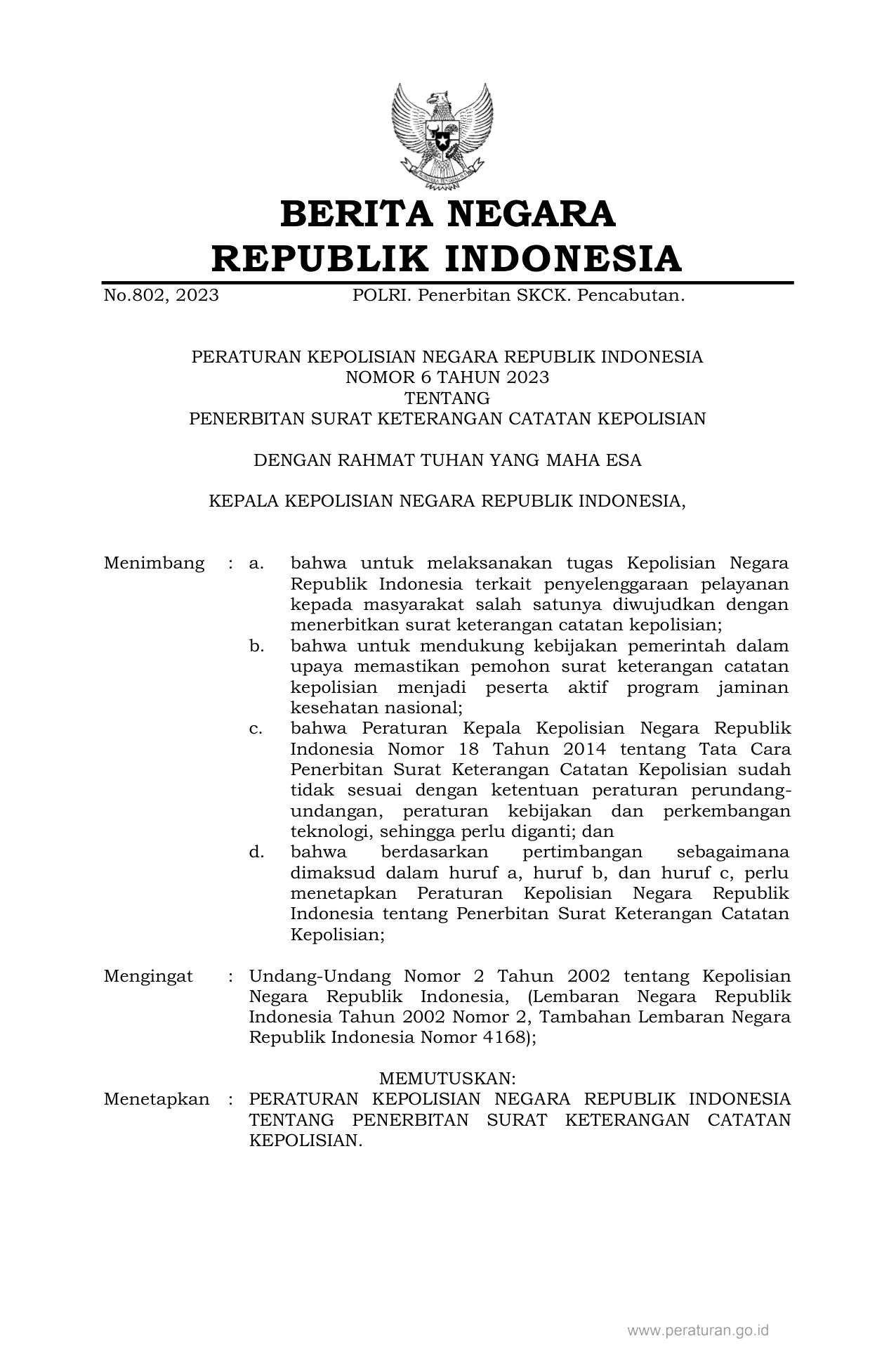 PERBAN Nomor 6 Tahun 2023 | Peraturan Badan Nomor 6 Tahun 2023 tentang PENERBITAN SURAT KETERANGAN CATATAN KEPOLISIAN
