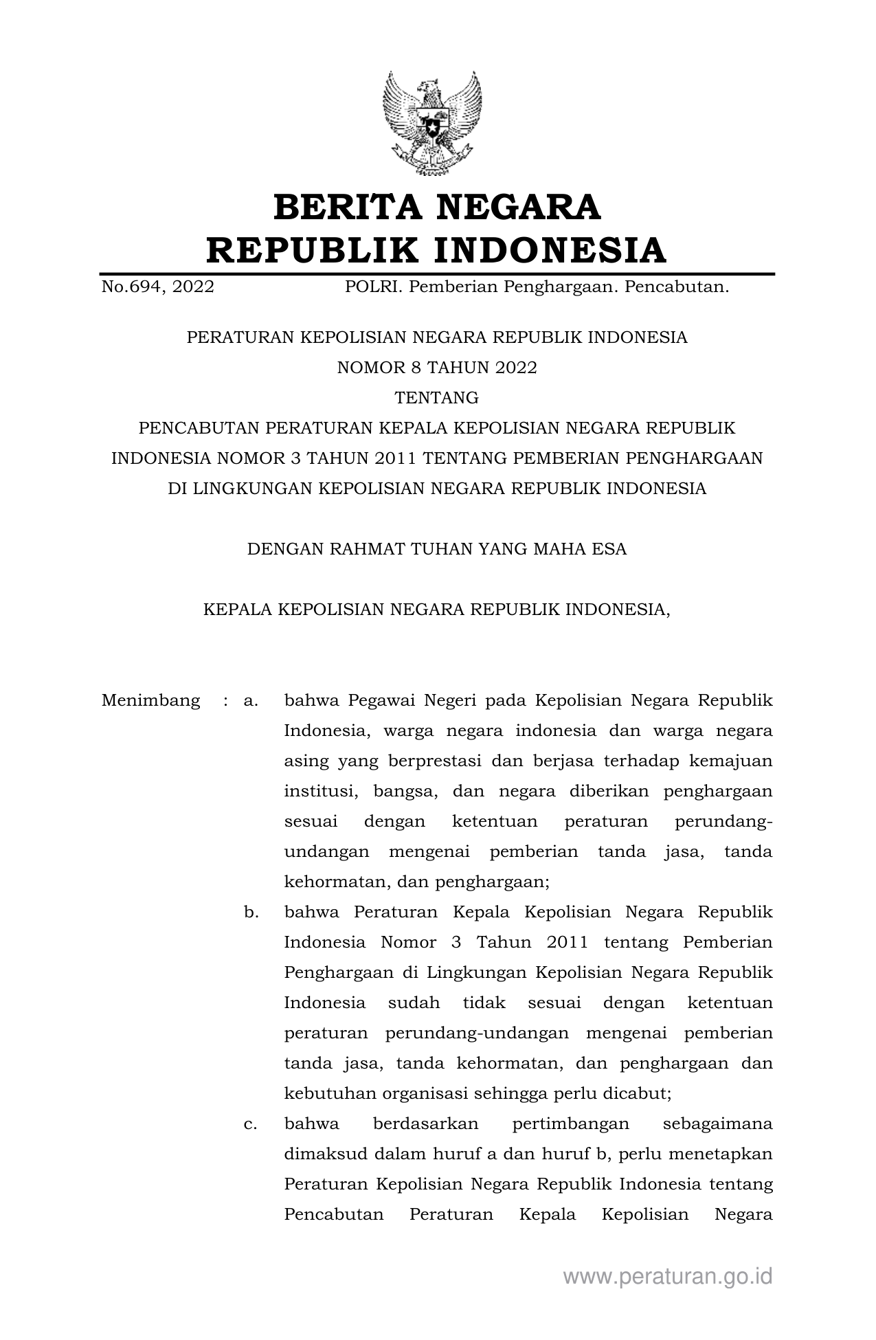 PERBAN Nomor 8 Tahun 2022 | Peraturan Badan Nomor 8 Tahun 2022 tentang PENCABUTAN PERATURAN KEPALA KEPOLISIAN NEGARA REPUBLIK INDONESIA NOMOR 3 TAHUN 2011 TENTANG PEMBERIAN PENGHARGAAN DI LINGKUNGAN KEPOLISIAN NEGARA REPUBLIK INDONESIA