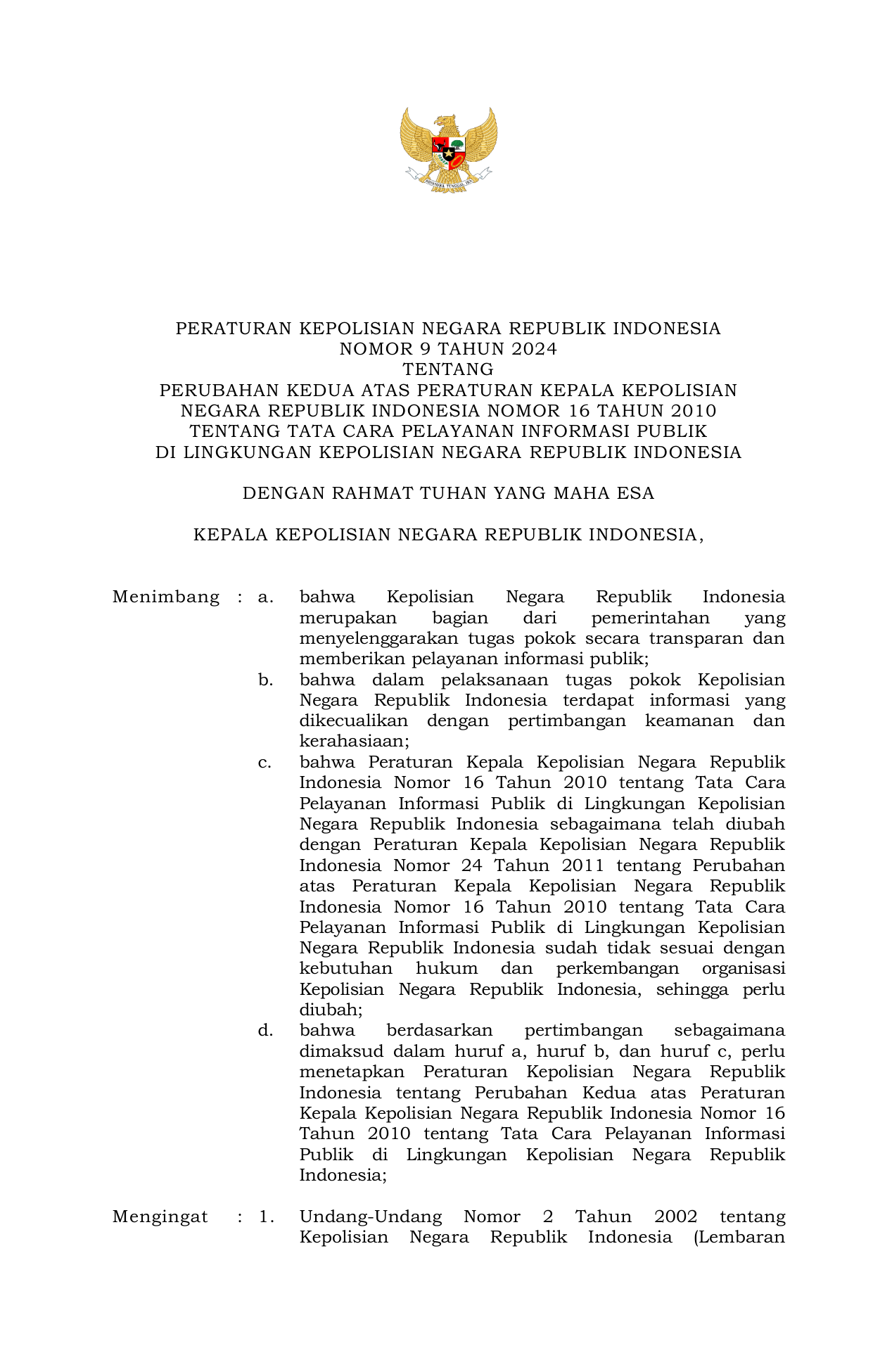 PERBAN Nomor 9 Tahun 2024 | Peraturan Badan Nomor 9 Tahun 2024 tentang Perubahan Kedua Atas Peraturan Kepala Kepolisian Negara Republik Indonesia Nomor 16 Tahun 2010 tentang Tata Cara Pelayanan Informasi Publik di Lingkungan Kepolisian Negara Indonesia