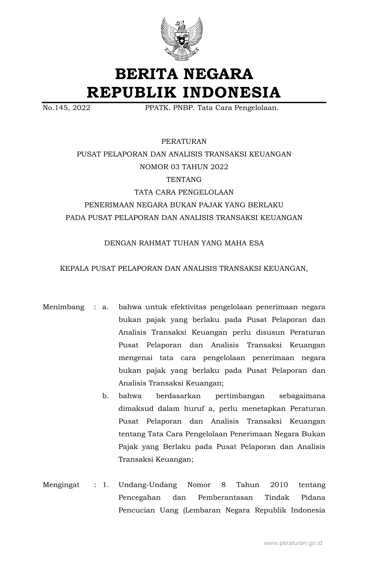 PERBAN Nomor 03 Tahun 2022 | Peraturan Badan Nomor 03 Tahun 2022 tentang TATA CARA PENGELOLAAN PENERIMAAN NEGARA BUKAN PAJAK YANG BERLAKU PADA PUSAT PELAPORAN DAN ANALISIS TRANSAKSI KEUANGAN