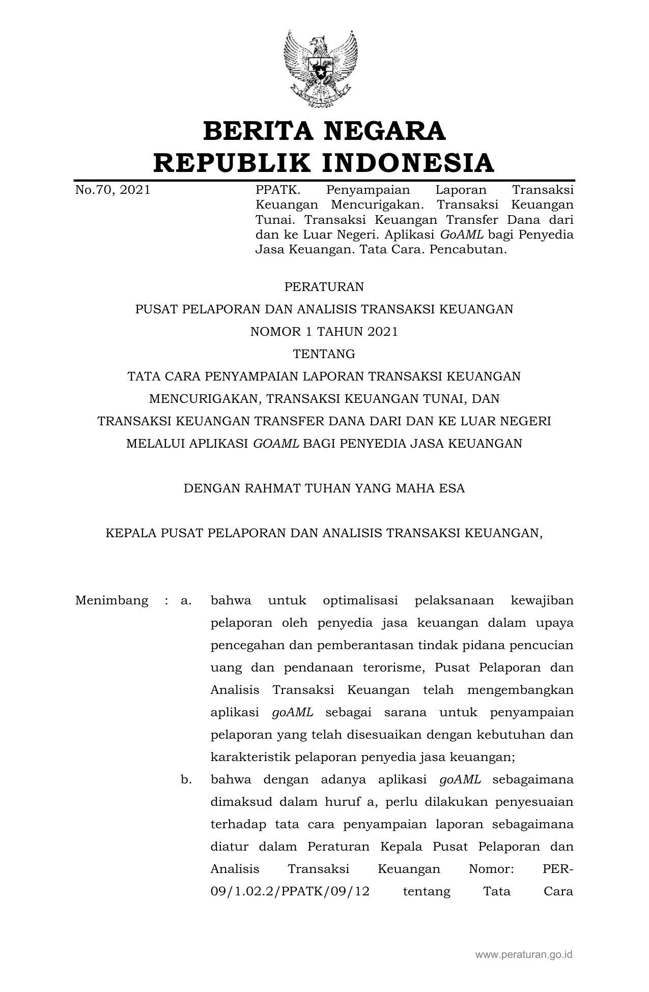 PERBAN Nomor 1 Tahun 2021 | Peraturan Badan Nomor 1 Tahun 2021 tentang TATA CARA PENYAMPAIAN LAPORAN TRANSAKSI KEUANGAN MENCURIGAKAN, TRANSAKSI KEUANGAN TUNAI, DAN TRANSAKSI KEUANGAN TRANSFER DANA DARI DAN KE LUAR NEGERI MELALUI APLIKASI GOAML BAGI PENYEDIA JASA KEUANGAN