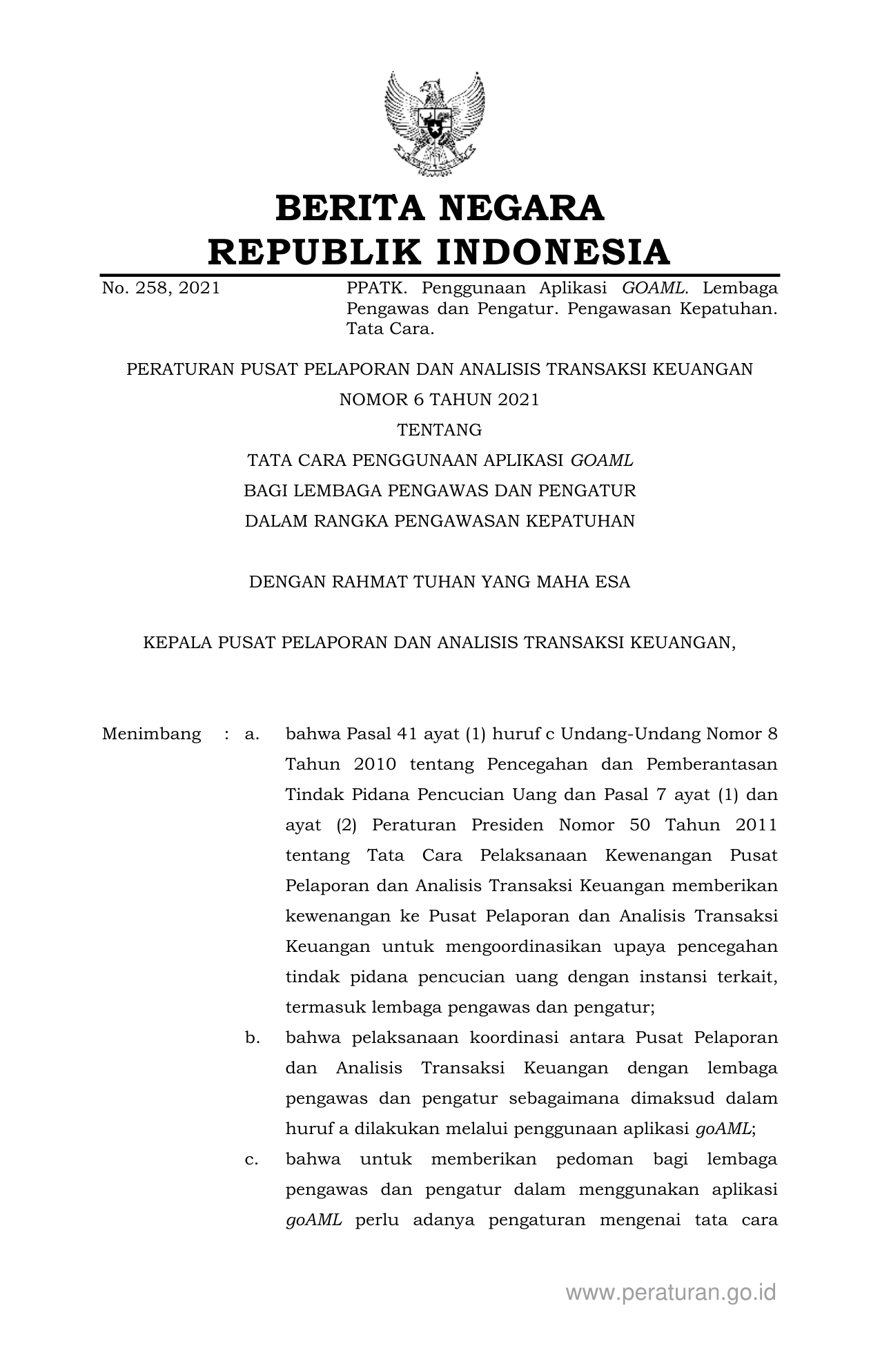 PERBAN Nomor 6 Tahun 2021 | Peraturan Badan Nomor 6 Tahun 2021 tentang TATA CARA PENGGUNAAN APLIKASI GOAML BAGI LEMBAGA PENGAWAS DAN PENGATUR DALAM RANGKA PENGAWASAN KEPATUHAN