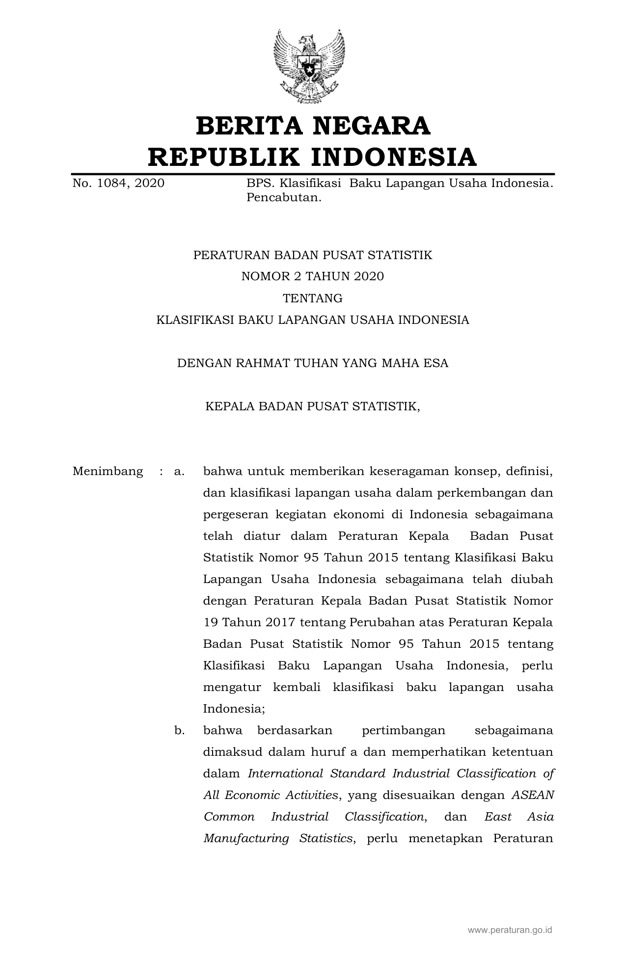 PERBAN Nomor 2 Tahun 2020 | Peraturan Badan Nomor 2 Tahun 2020 tentang KLASIFIKASI BAKU LAPANGAN USAHA INDONESIA