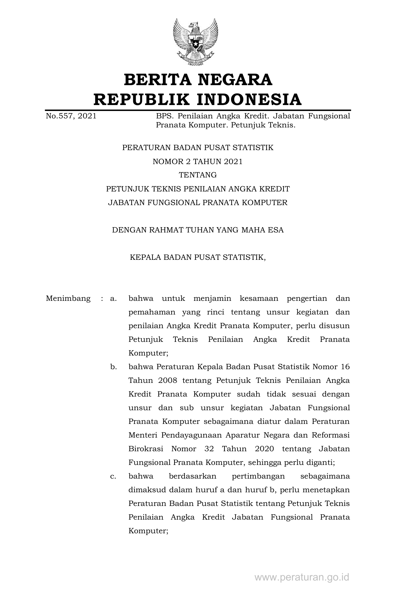 PERBAN Nomor 2 Tahun 2021 | Peraturan Badan Nomor 2 Tahun 2021 tentang PETUNJUK TEKNIS PENILAIAN ANGKA KREDIT JABATAN FUNGSIONAL PRANATA KOMPUTER