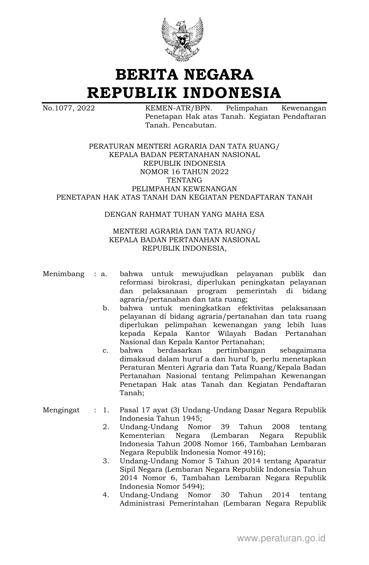 PERBAN Nomor 16 Tahun 2022 | Peraturan Badan Nomor 16 Tahun 2022 tentang PELIMPAHAN KEWENANGAN PENETAPAN HAK ATAS TANAH DAN KEGIATAN PENDAFTARAN TANAH