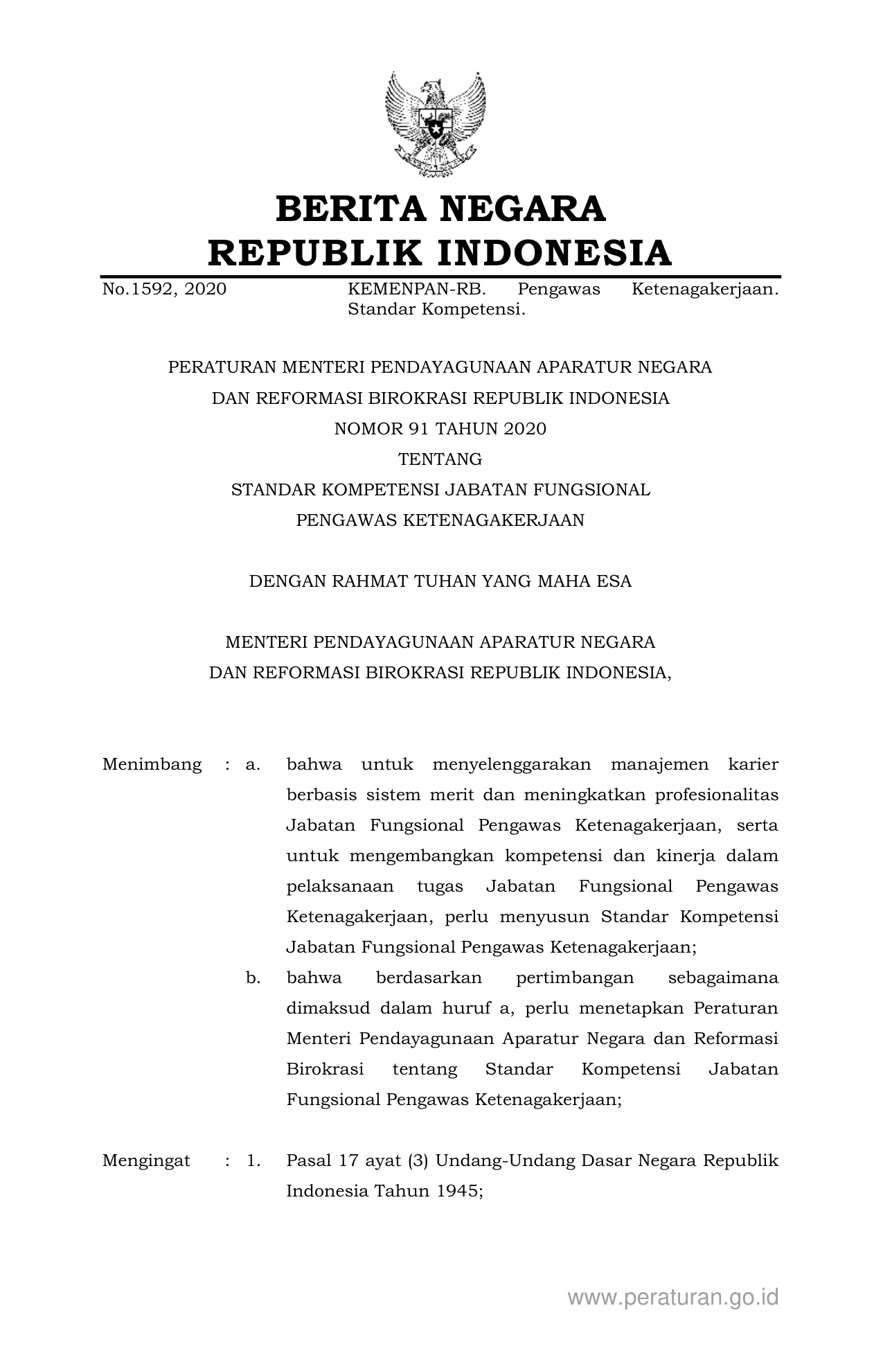PERBAN Nomor 91 Tahun 2020 | Peraturan Badan Nomor 91 Tahun 2020 tentang STANDAR KOMPETENSI JABATAN FUNGSIONAL PENGAWAS KETENAGAKERJAAN