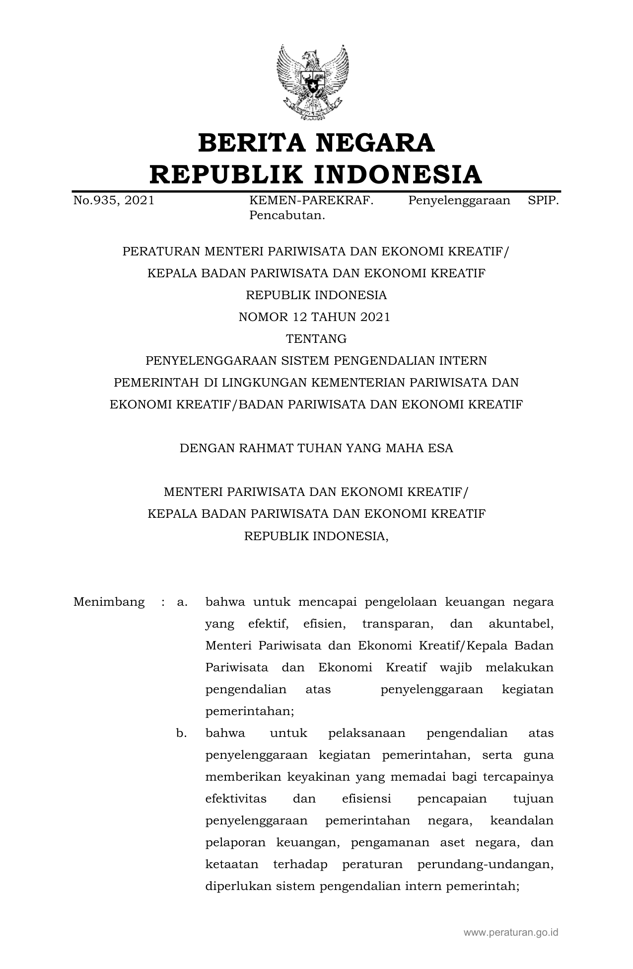 PERBAN Nomor 12 Tahun 2021 | Peraturan Badan Nomor 12 Tahun 2021 tentang PENYELENGGARAAN SISTEM PENGENDALIAN INTERN PEMERINTAH DI LINGKUNGAN KEMENTERIAN PARIWISATA DAN EKONOMI KREATIF/BADAN PARIWISATA DAN EKONOMI KREATIF