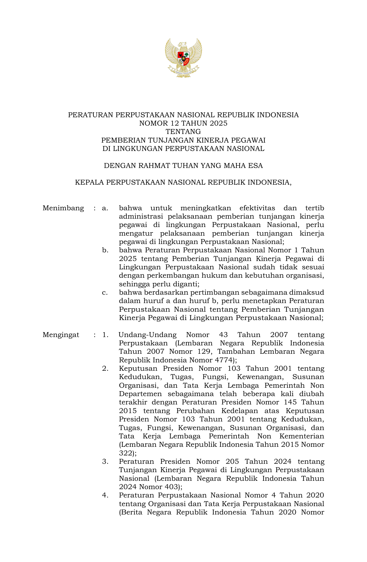 PERBAN Nomor 12 Tahun 2025 | Peraturan Badan Nomor 12 Tahun 2025 tentang Pemberian Tunjangan Kinerja Pegawai di Lingkungan Perpustakaan Nasional