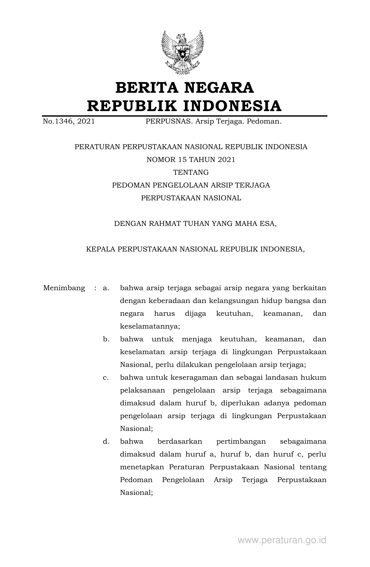 PERBAN Nomor 15 Tahun 2021 | Peraturan Badan Nomor 15 Tahun 2021 tentang PEDOMAN PENGELOLAAN ARSIP TERJAGA PERPUSTAKAAN NASIONAL