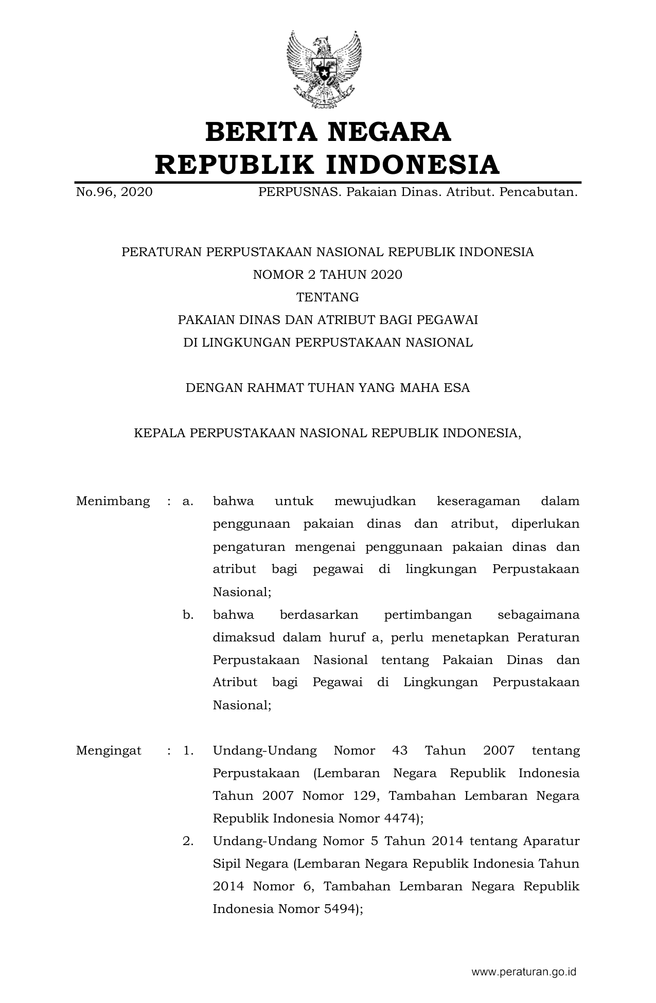 PERBAN Nomor 2 Tahun 2020 | Peraturan Badan Nomor 2 Tahun 2020 tentang PAKAIAN DINAS DAN ATRIBUT BAGI PEGAWAI DI LINGKUNGAN PERPUSTAKAAN NASIONAL