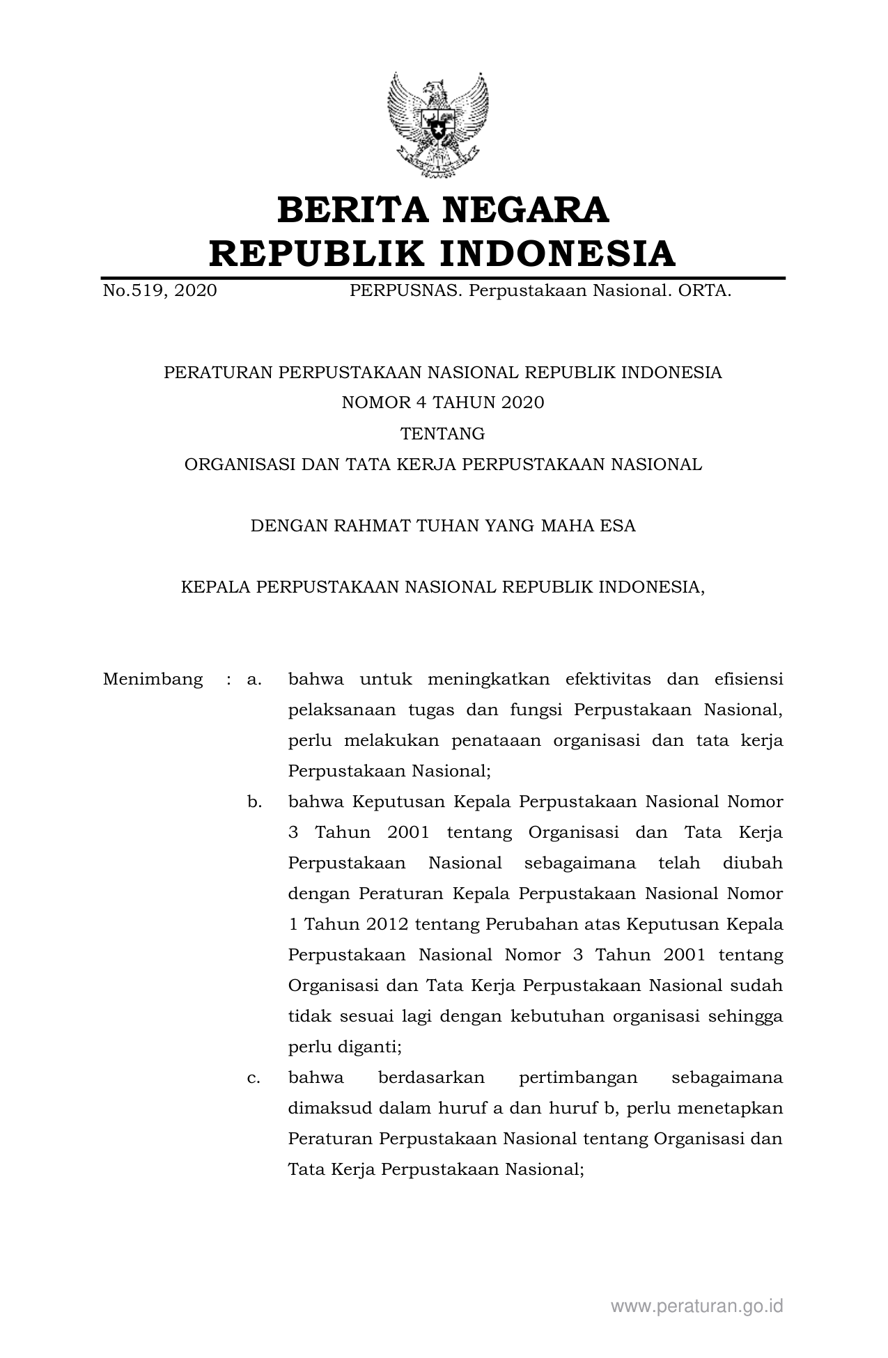 PERBAN Nomor 4 Tahun 2020 | Peraturan Badan Nomor 4 Tahun 2020 tentang ORGANISASI DAN TATA KERJA PERPUSTAKAAN NASIONAL
