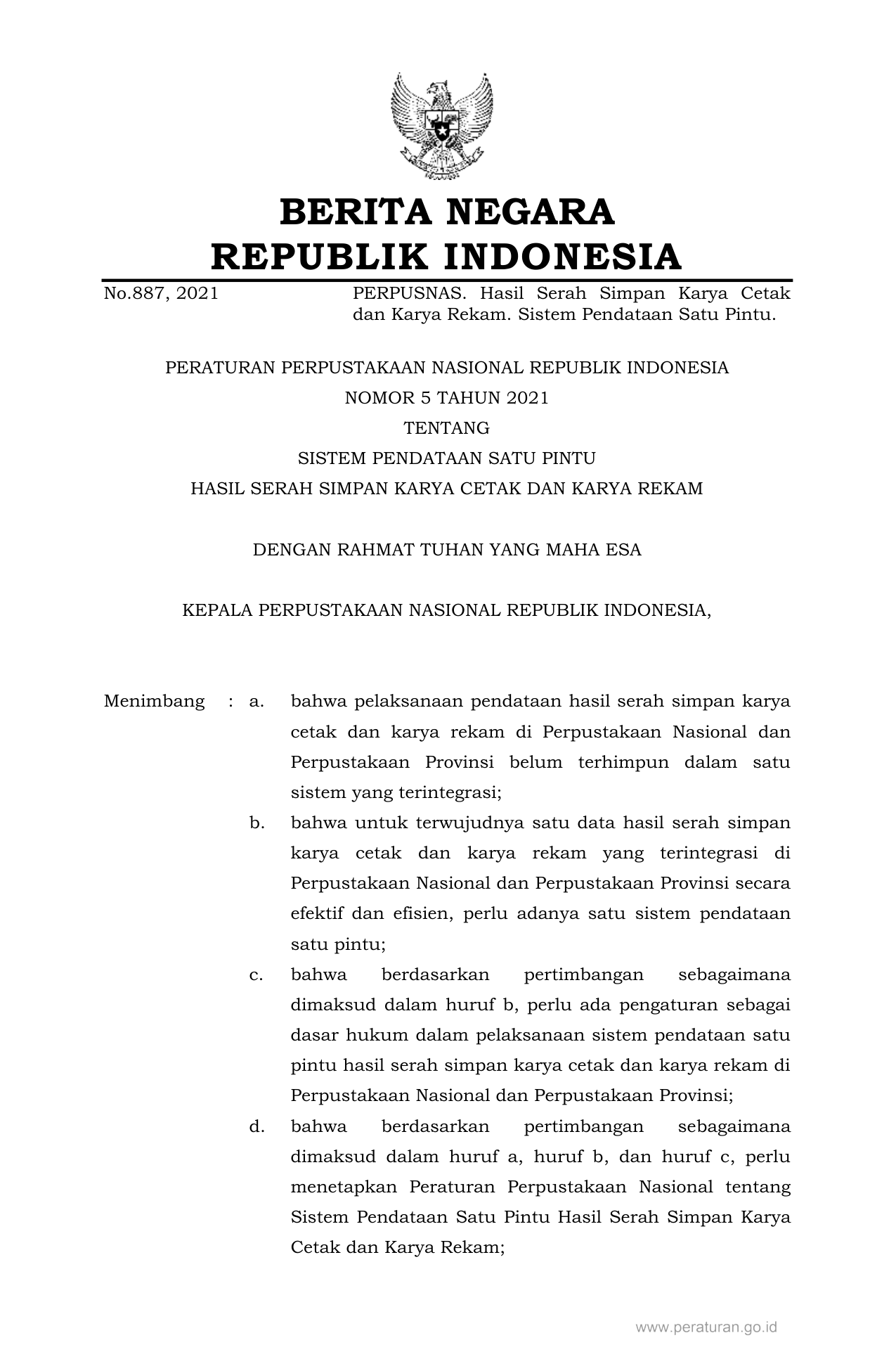 PERBAN Nomor 5 Tahun 2021 | Peraturan Badan Nomor 5 Tahun 2021 tentang SISTEM PENDATAAN SATU PINTU HASIL SERAH SIMPAN KARYA CETAK DAN KARYA REKAM