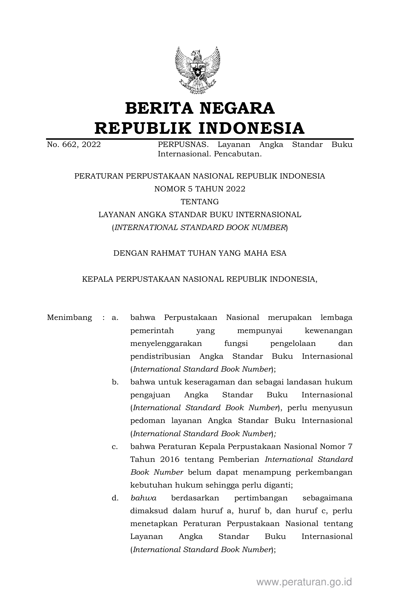 PERBAN Nomor 5 Tahun 2022 | Peraturan Badan Nomor 5 Tahun 2022 tentang LAYANAN ANGKA STANDAR BUKU INTERNASIONAL (INTERNATIONAL STANDARD BOOK NUMBER)
