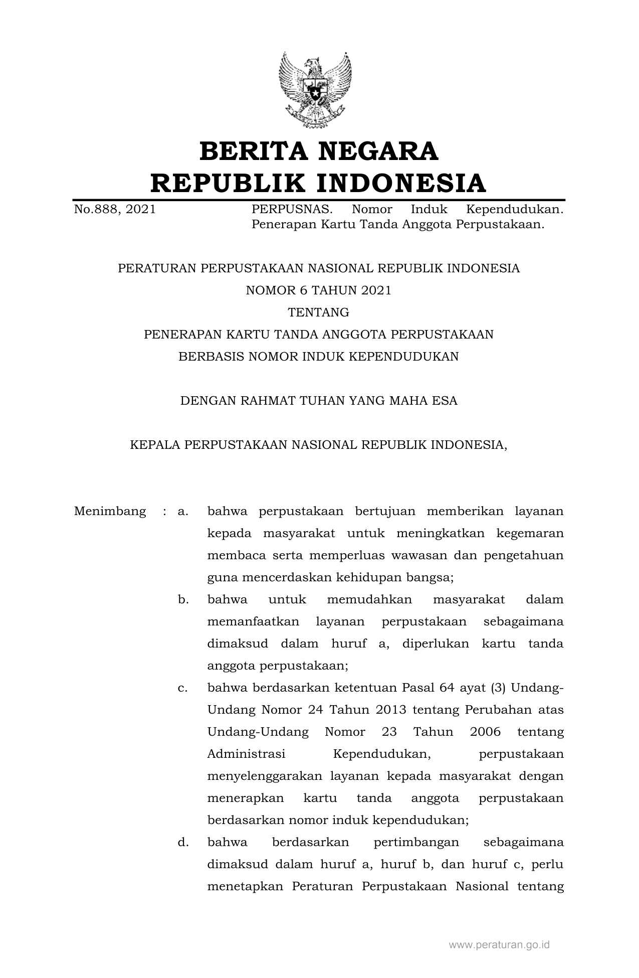 PERBAN Nomor 6 Tahun 2021 | Peraturan Badan Nomor 6 Tahun 2021 tentang PENERAPAN KARTU TANDA ANGGOTA PERPUSTAKAAN BERBASIS NOMOR INDUK KEPENDUDUKAN