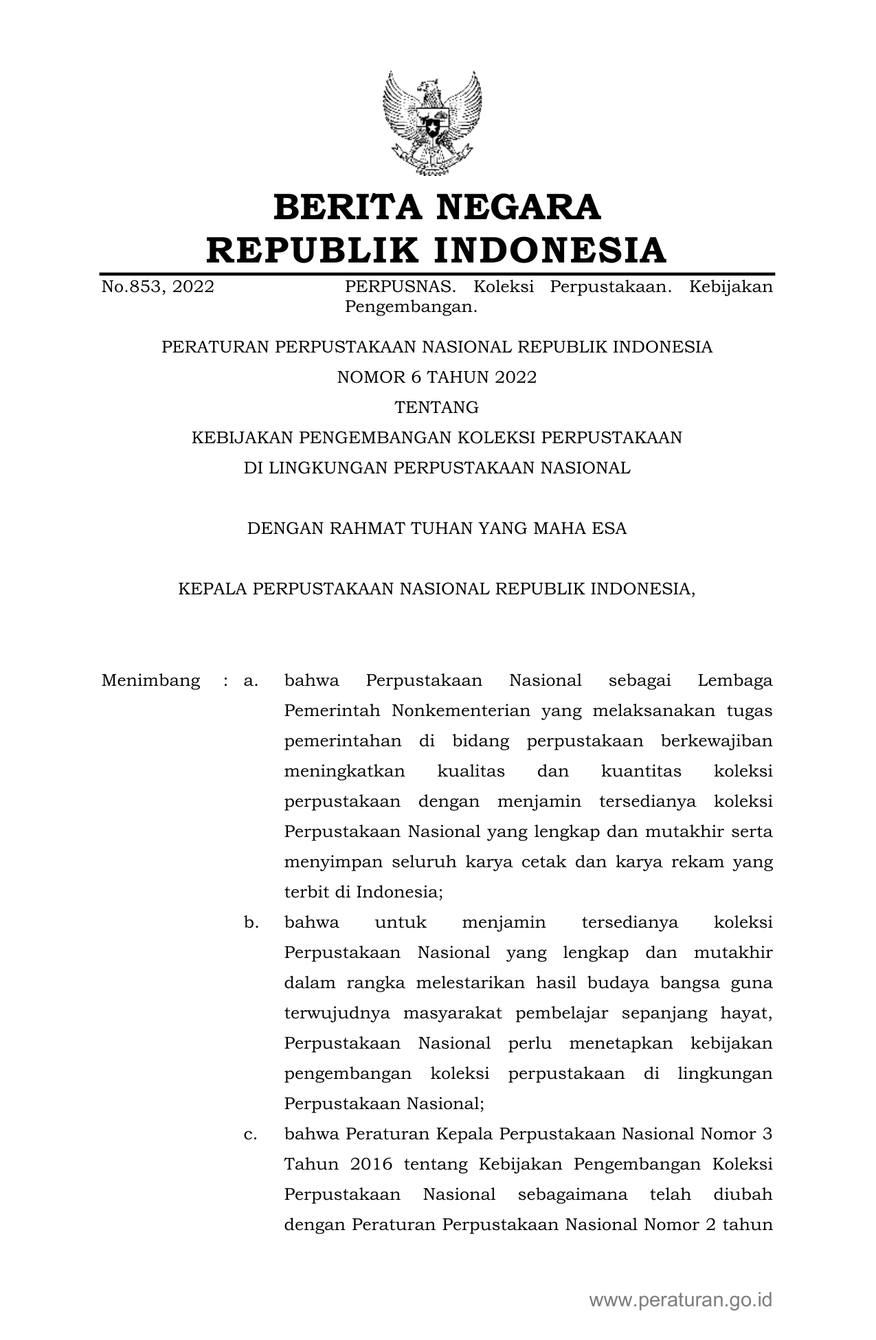 PERBAN Nomor 6 Tahun 2022 | Peraturan Badan Nomor 6 Tahun 2022 tentang KEBIJAKAN PENGEMBANGAN KOLEKSI PERPUSTAKAAN DI LINGKUNGAN PERPUSTAKAAN NASIONAL