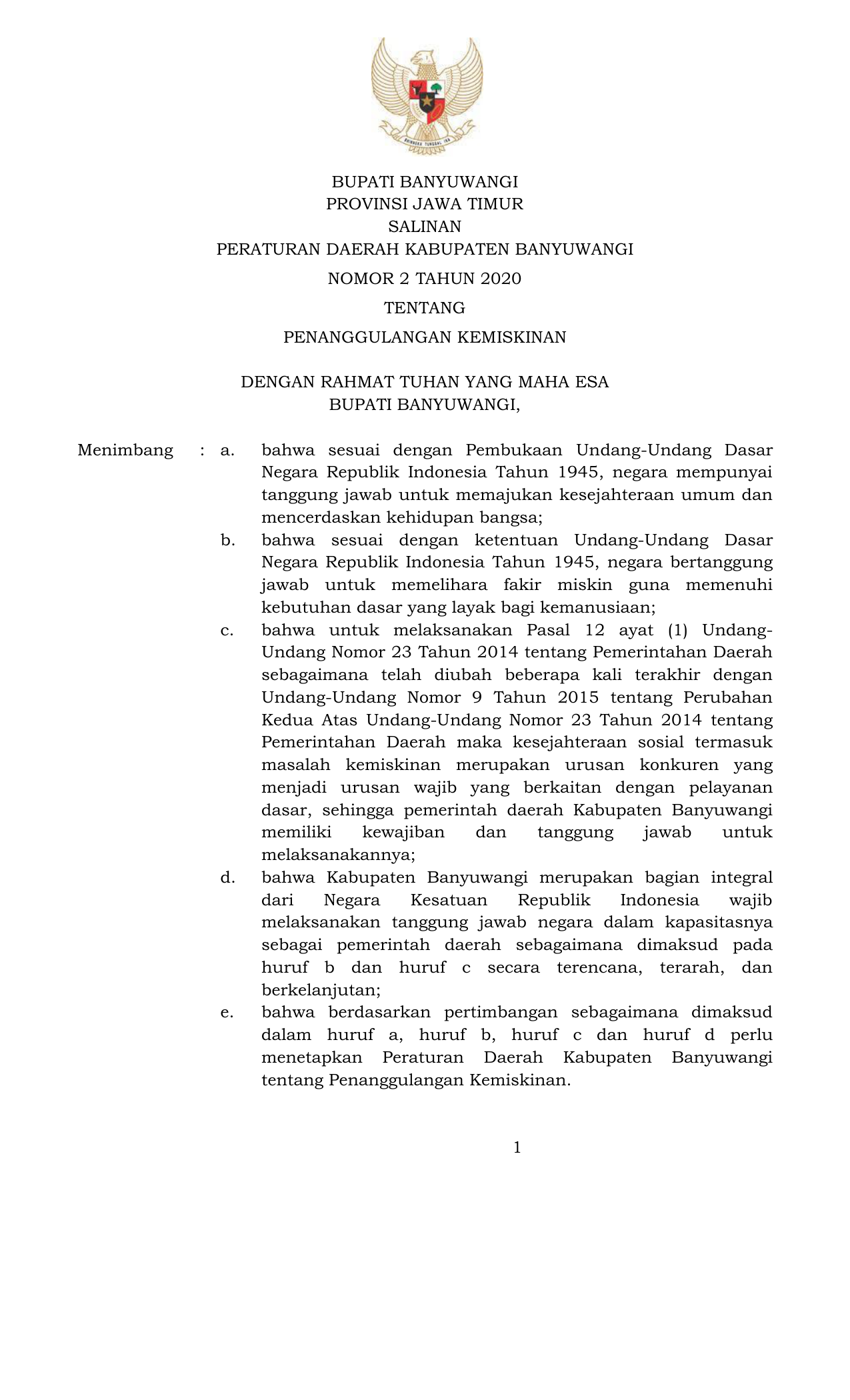 PERDA Nomor 2 Tahun 2020 | Peraturan Daerah Nomor 2 Tahun 2020 tentang PENANGGULANGAN KEMISKINAN