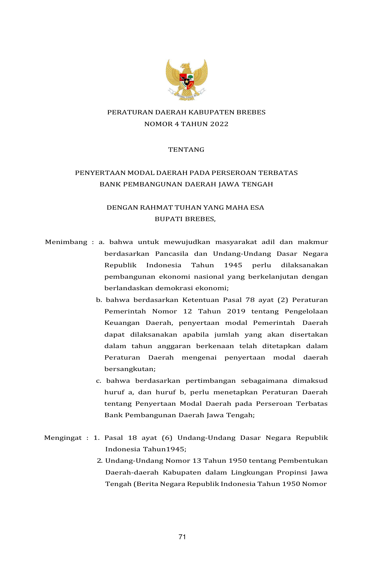 PERDA Nomor 4 Tahun 2022 | Peraturan Daerah Nomor 4 Tahun 2022 tentang PENYERTAAN MODAL DAERAH PADA PERSEROAN TERBATASBANK PEMBANGUNAN DAERAH JAWA TENGAH