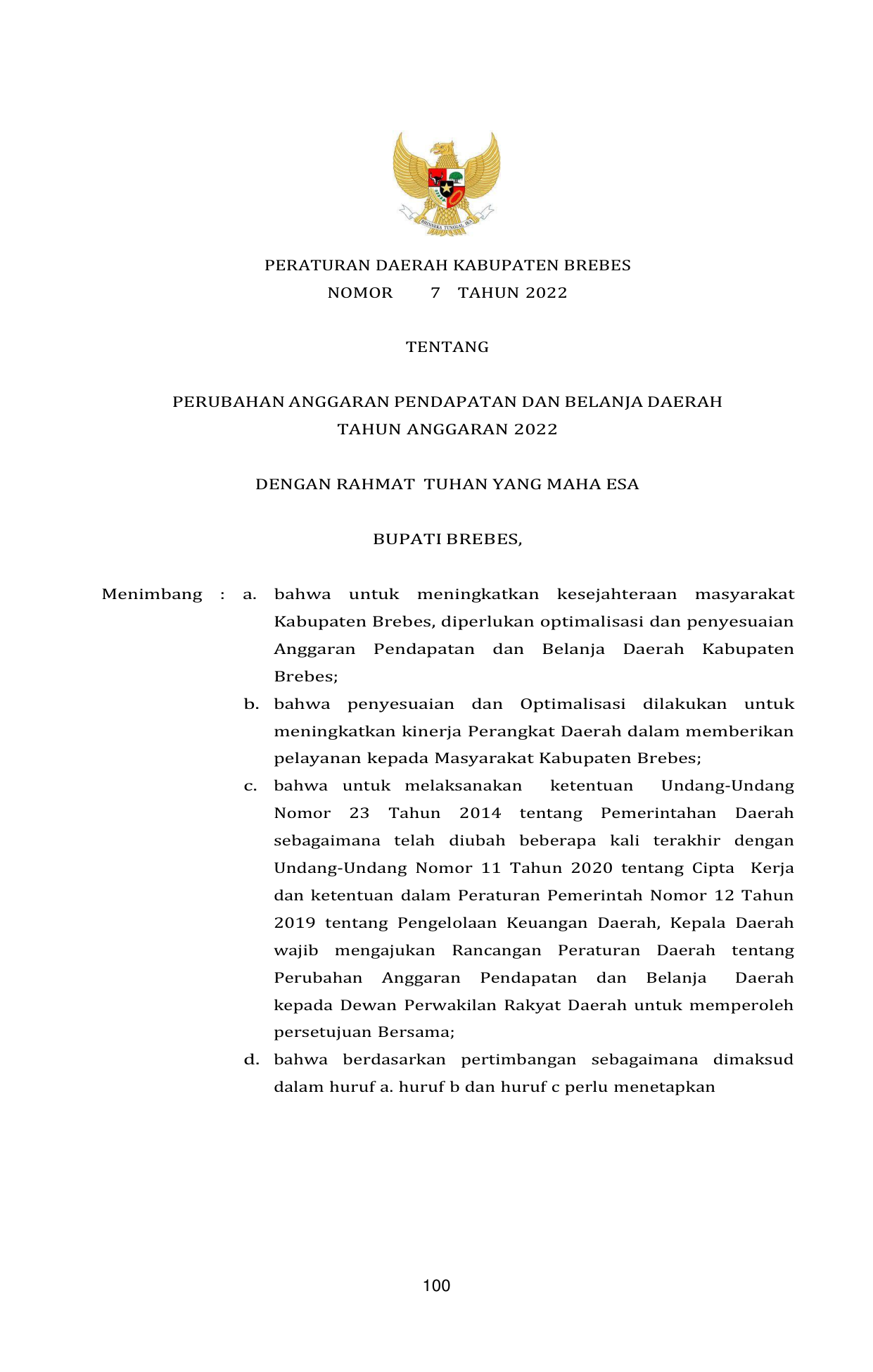 PERDA Nomor 7 Tahun 2022 | Peraturan Daerah Nomor 7 Tahun 2022 tentang PERUBAHAN ANGGARAN PENDAPATAN DANBELANJA DAERAHTAHUN ANGGARAN 2022