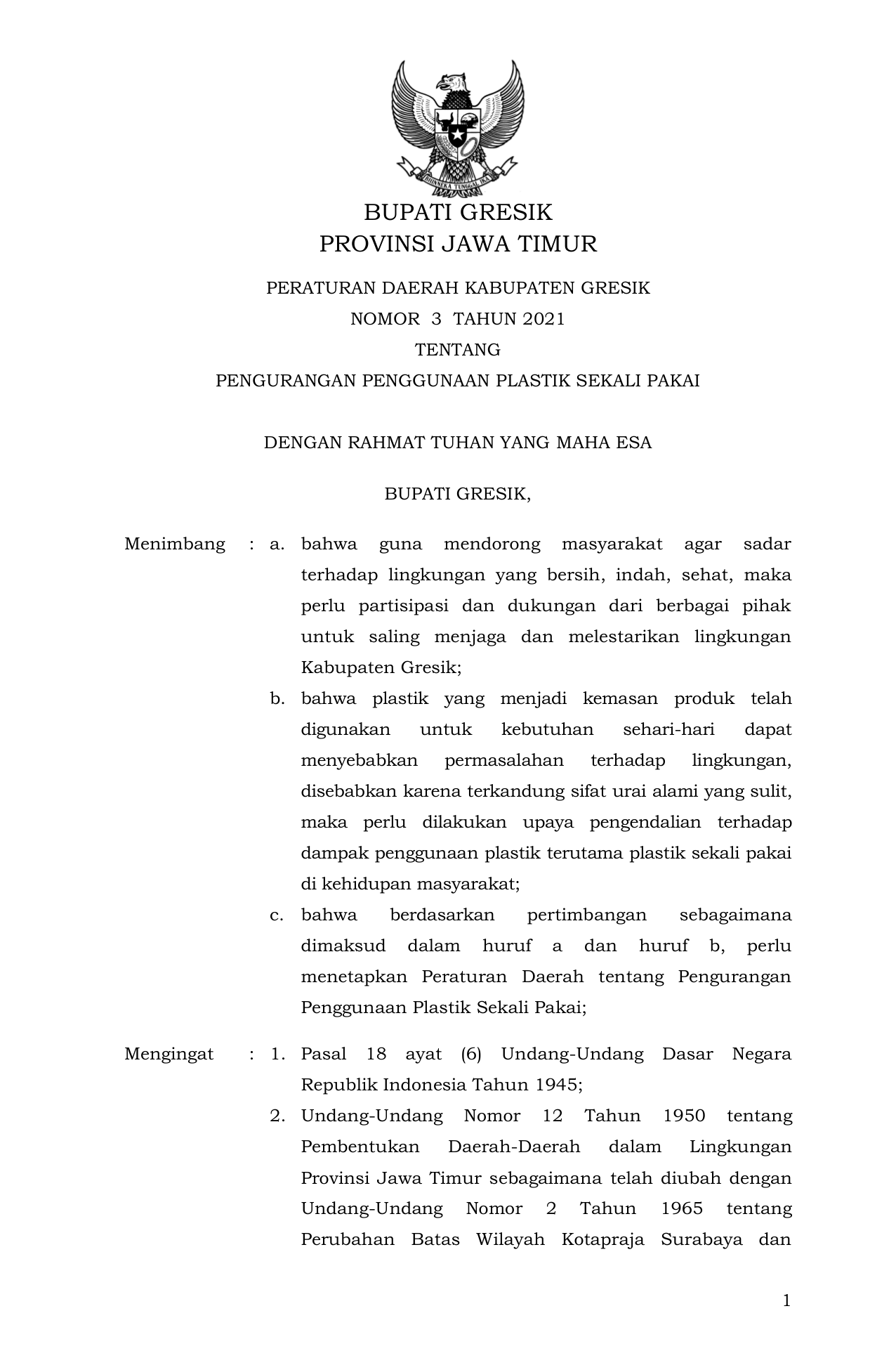 PERDA Nomor 3 Tahun 2021 | Peraturan Daerah Nomor 3 Tahun 2021 tentang PERATURAN DAERAH KABUPATEN GRESIK NOMOR 3 TAHUN 2021 TENTANG PENGURANGAN PENGGUNAAN PLASTIK SEKALI PAKAI