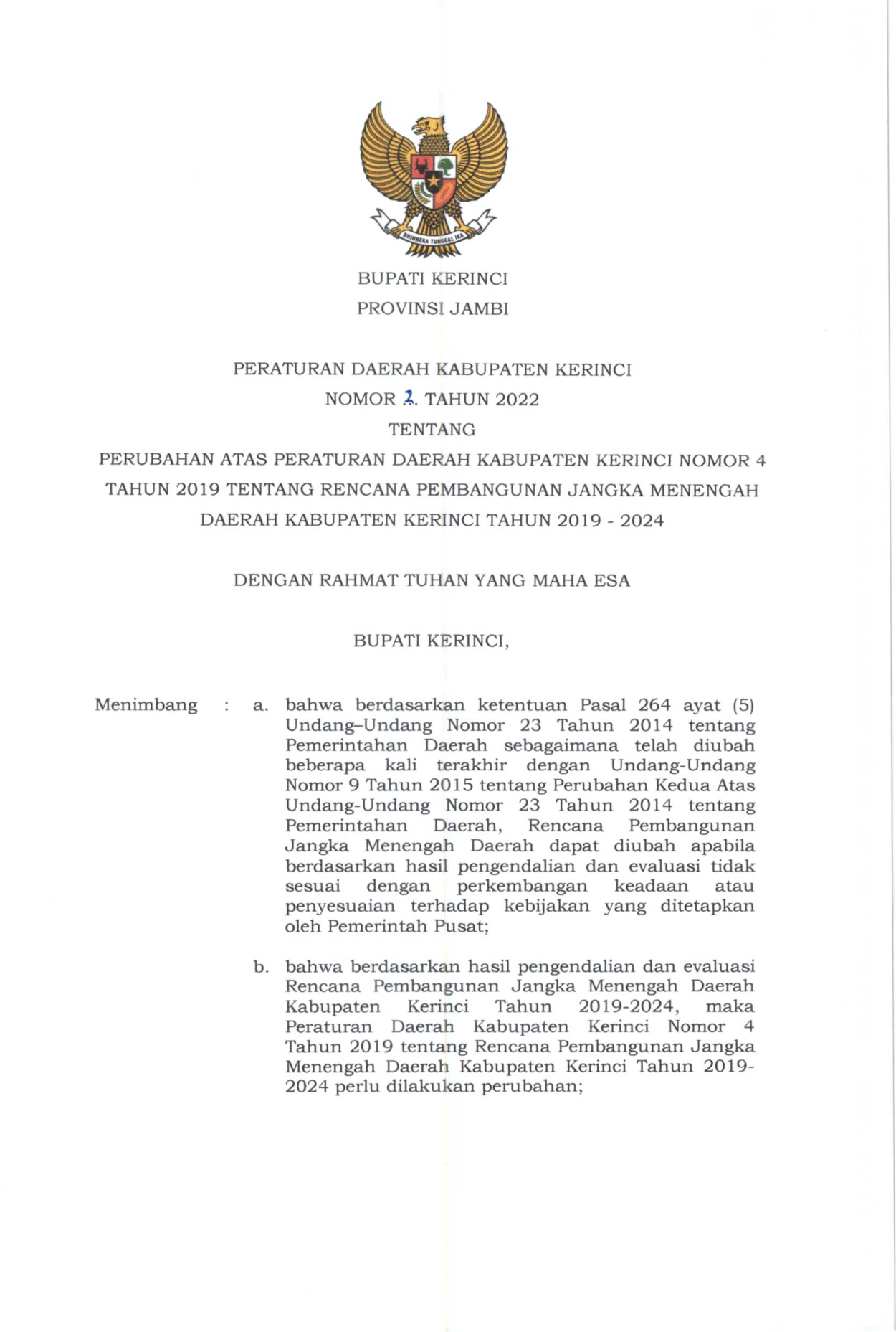 PERDA Nomor 2 Tahun 2022 | Peraturan Daerah Nomor 2 Tahun 2022 tentang Perubahan Atas Peraturan Daerah Kabupaten Kerinci Nomor 4 Tahun 2019 tentang Rencana Pembangunan Jangka Menengah Daerah Kabupaten Kerinci Tahun 2019-2024 (RPJMD Tahun 2019-2024)