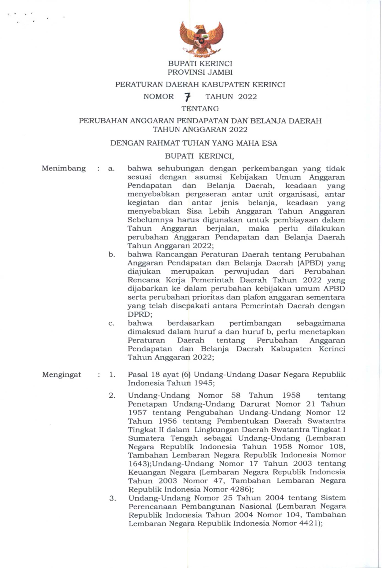 PERDA Nomor 7 Tahun 2022 | Peraturan Daerah Nomor 7 Tahun 2022 tentang Perubahan Anggaran Pendapatan dan Belanja Daerah Tahun Anggaran 2022 (APBDP Tahun 2022)