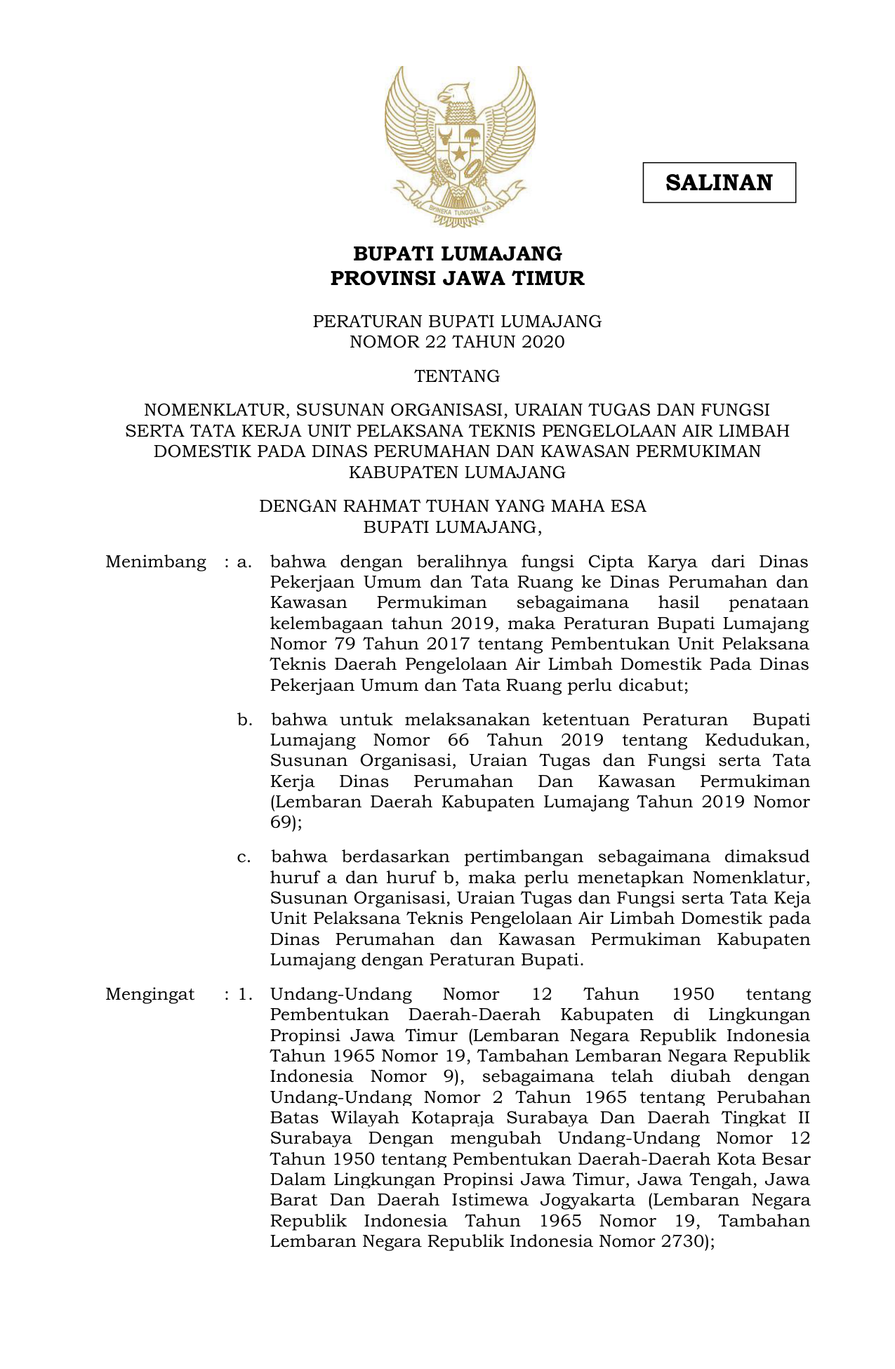 PERDA Nomor 22 Tahun 2020 | Peraturan Daerah Nomor 22 Tahun 2020 tentang NOMENKLATUR, SUSUNAN ORGANISASI, URAIAN TUGAS DAN FUNGSISERTA TATA KERJA UNIT PELAKSANA TEKNIS PENGELOLAAN AIR LIMBAHDOMESTIK PADA DINAS PERUMAHAN DAN KAWASAN PERMUKIMANKABUPATEN LUMAJANG