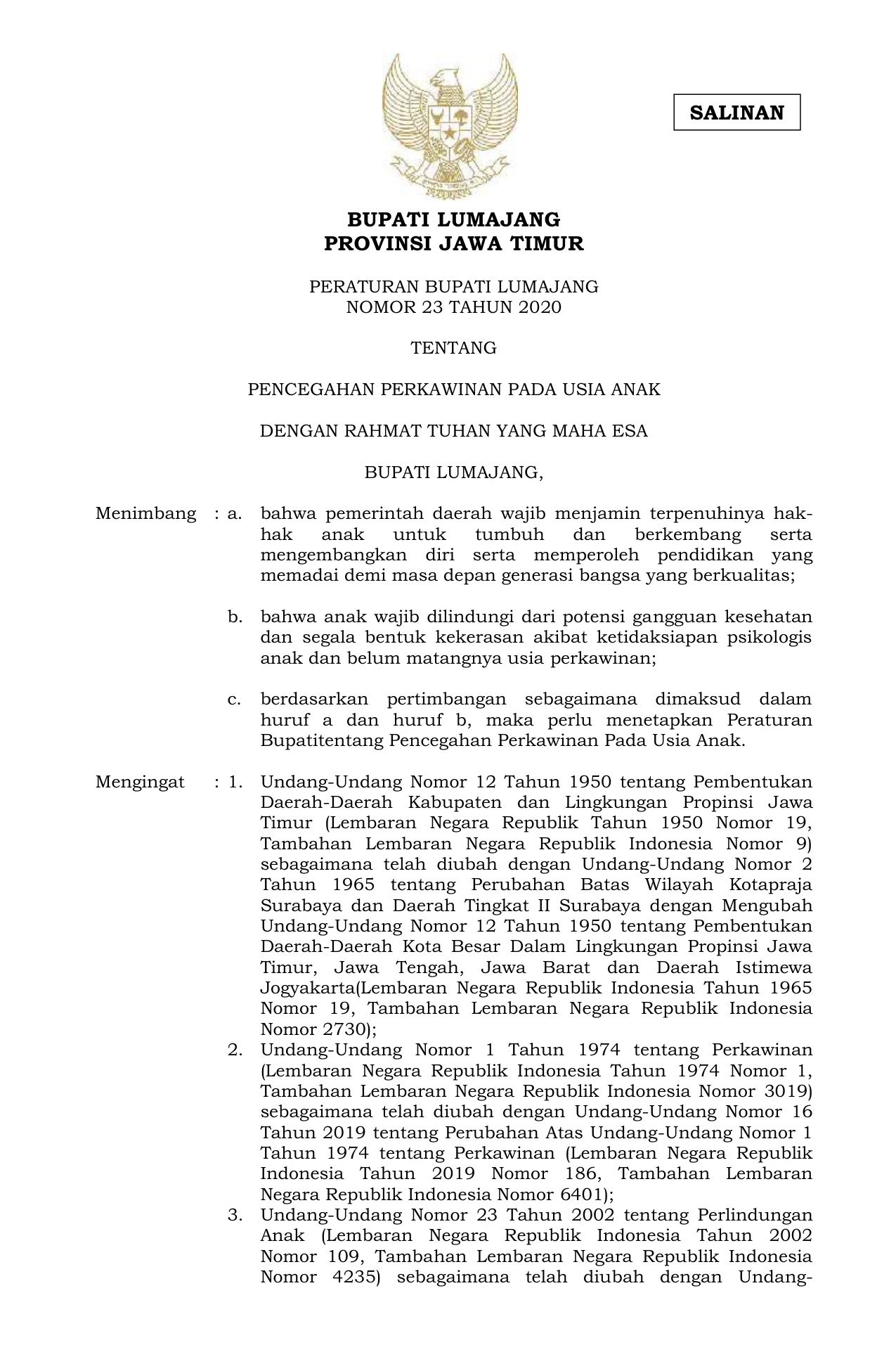 PERDA Nomor 23 Tahun 2020 | Peraturan Daerah Nomor 23 Tahun 2020 tentang PENCEGAHAN PERKAWINAN PADA USIA ANAK