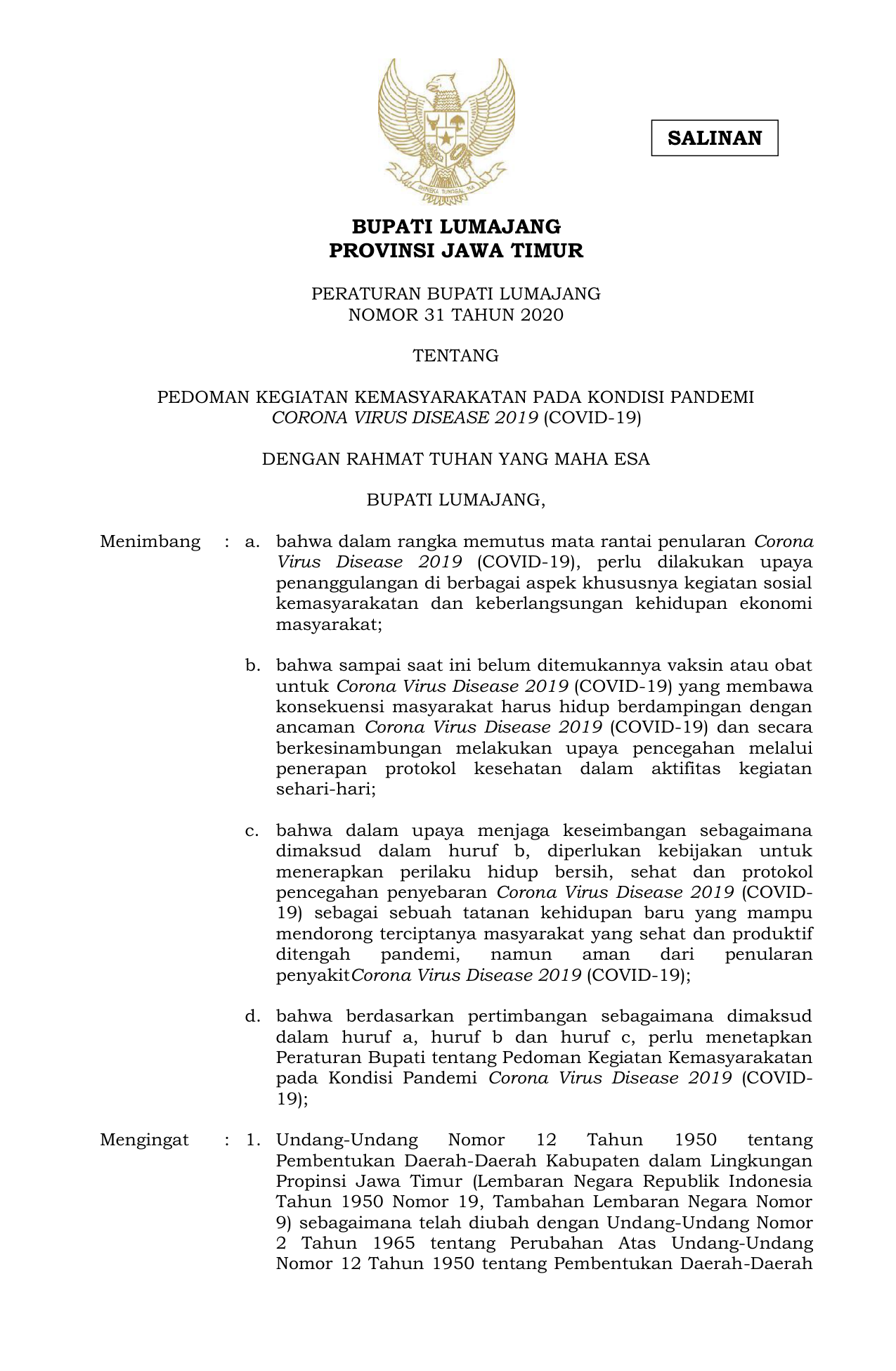 PERDA Nomor 31 Tahun 2020 | Peraturan Daerah Nomor 31 Tahun 2020 tentang PEDOMAN KEGIATAN KEMASYARAKATAN PADA KONDISI PANDEMICORONA VIRUS DISEASE 2019 (COVID-19)
