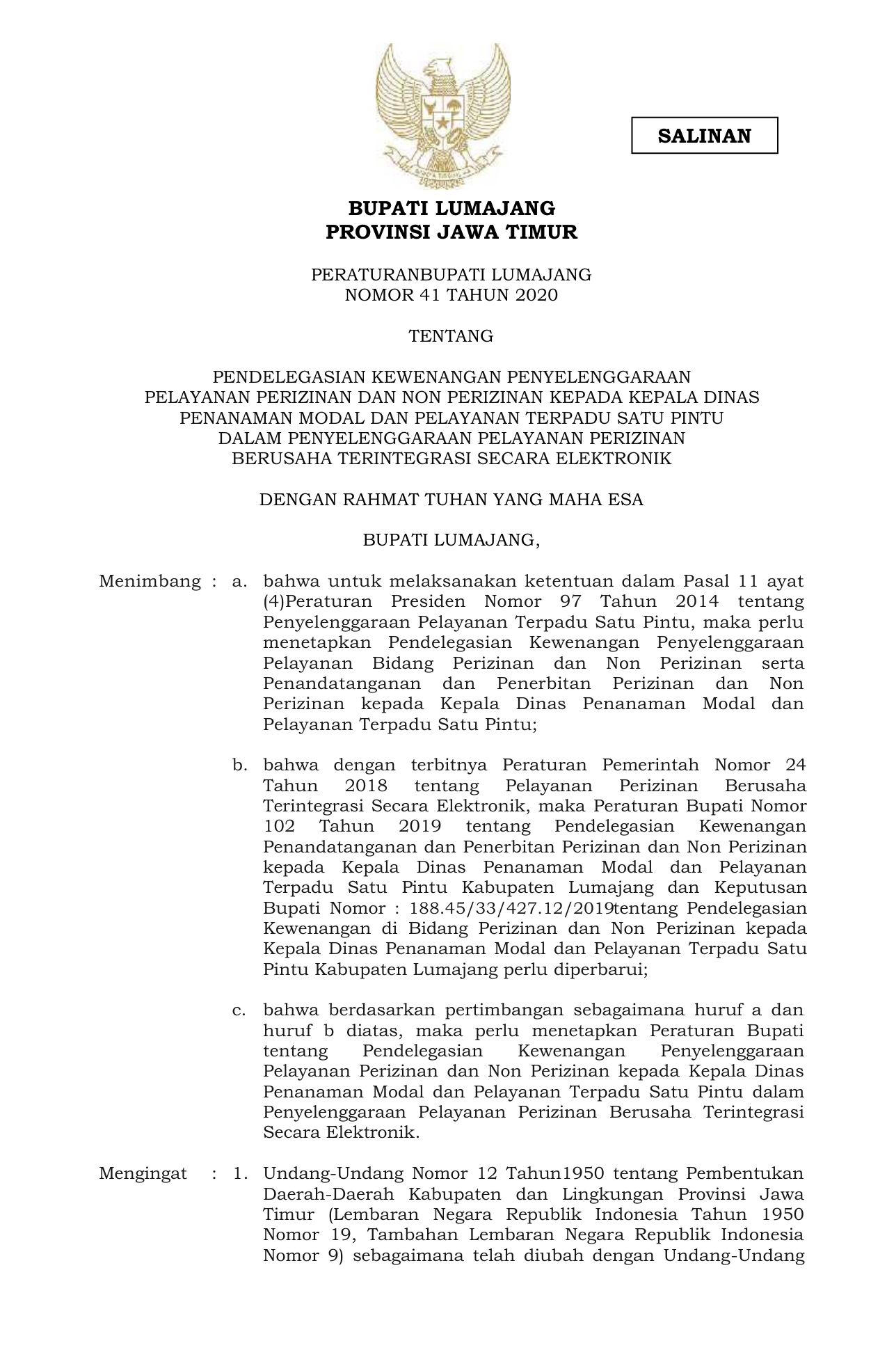 PERDA Nomor 41 Tahun 2020 | Peraturan Daerah Nomor 41 Tahun 2020 tentang PENDELEGASIAN KEWENANGAN PENYELENGGARAANPELAYANAN PERIZINAN DAN NON PERIZINAN KEPADA KEPALA DINASPENANAMAN MODAL DAN PELAYANAN TERPADU SATU PINTUDALAM PENYELENGGARAAN PELAYANAN PERIZINANBERUSAHA TERINTEGRASI SECARA ELEKTRONIK
