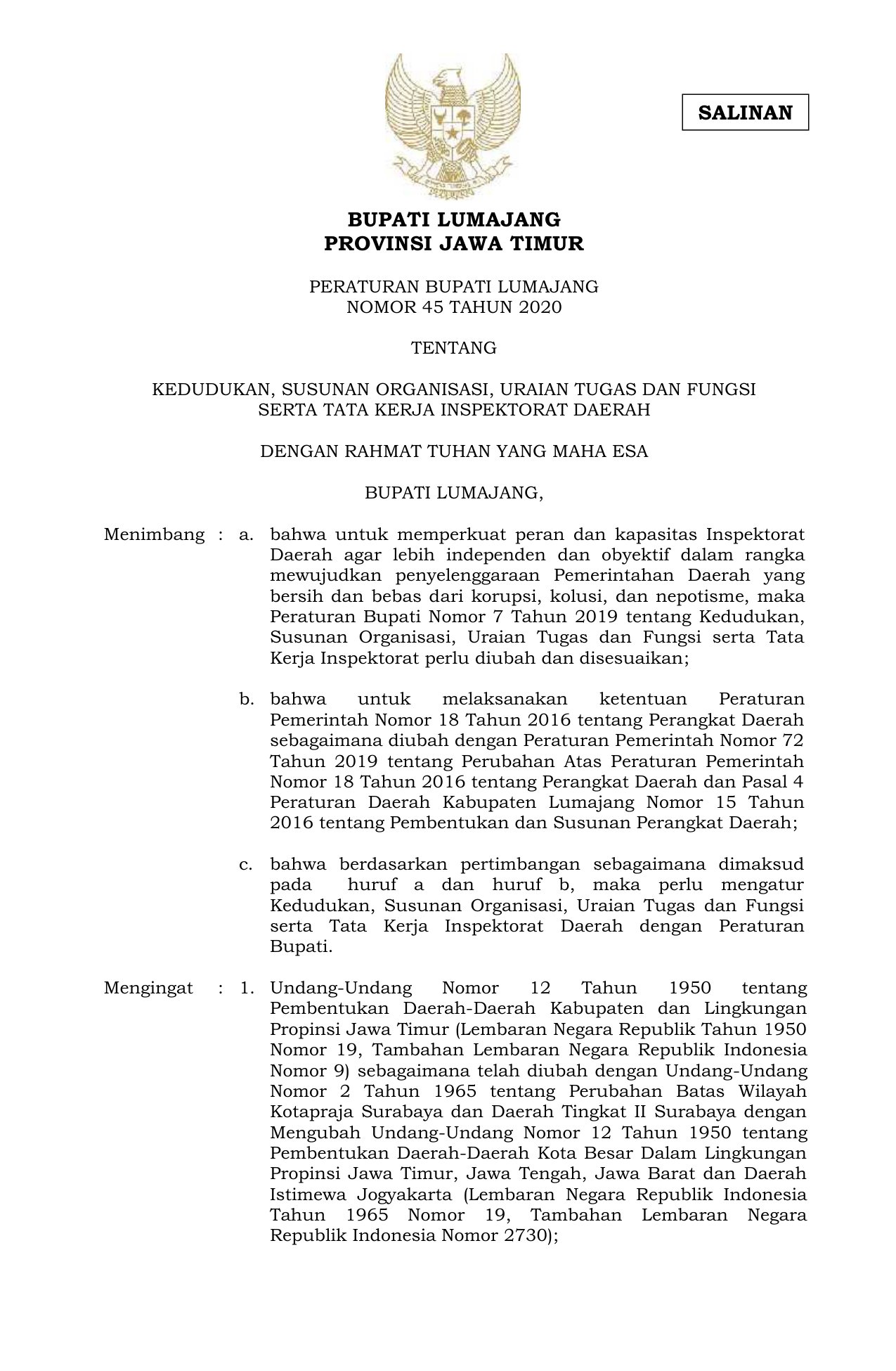 PERDA Nomor 45 Tahun 2020 | Peraturan Daerah Nomor 45 Tahun 2020 tentang KEDUDUKAN, SUSUNAN ORGANISASI, URAIAN TUGAS DAN FUNGSISERTA TATA KERJA INSPEKTORAT DAERAH