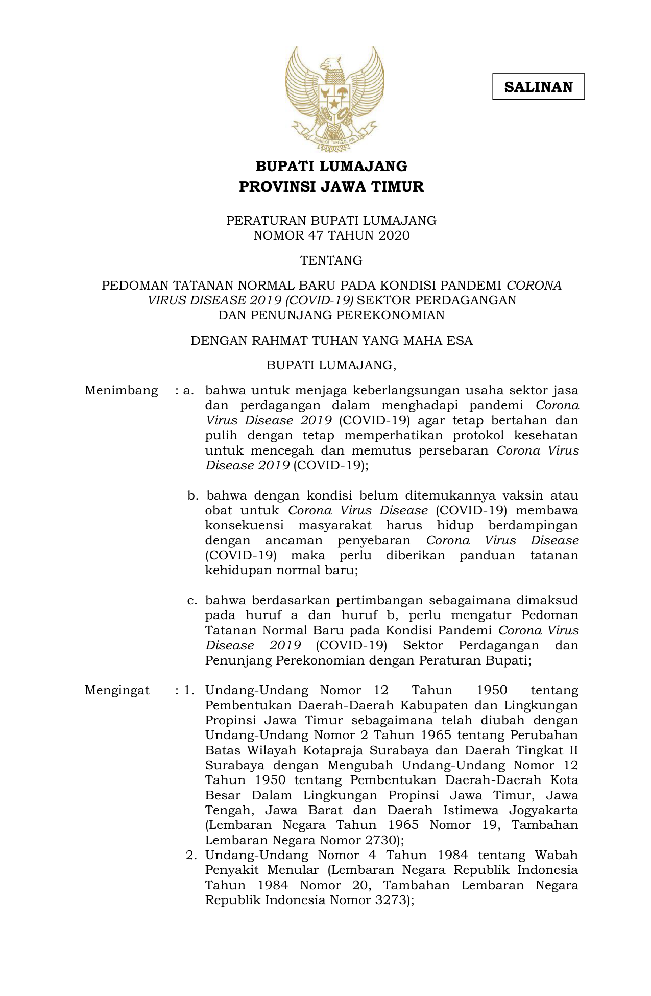 PERDA Nomor 47 Tahun 2020 | Peraturan Daerah Nomor 47 Tahun 2020 tentang PEDOMAN TATANAN NORMAL BARU PADA KONDISI PANDEMI CORONAVIRUS DISEASE 2019 (COVID-19) SEKTOR PERDAGANGANDAN PENUNJANG PEREKONOMIAN