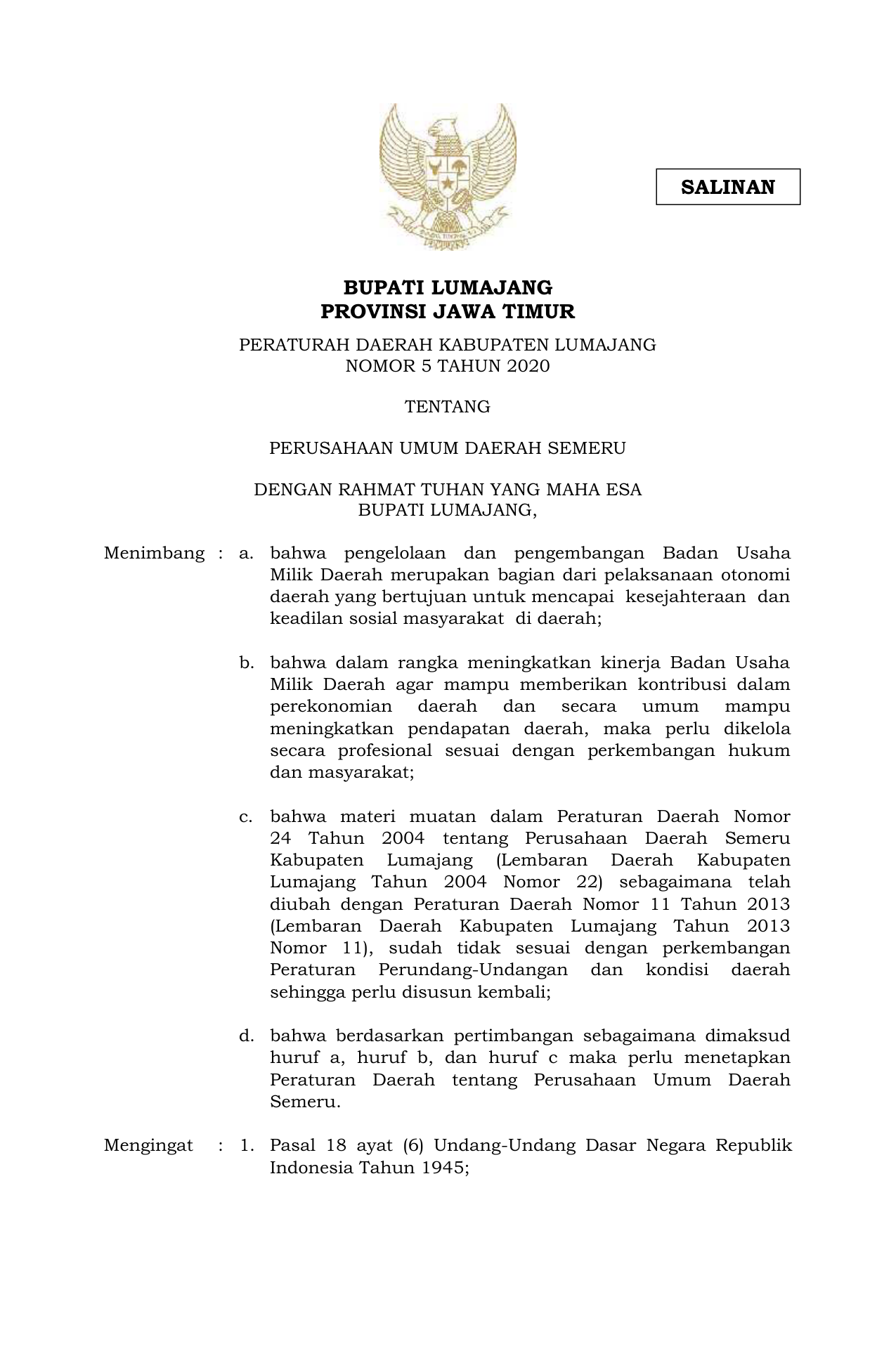 PERDA Nomor 5 Tahun 2020 | Peraturan Daerah Nomor 5 Tahun 2020 tentang PERUSAHAAN UMUM DAERAH SEMERU