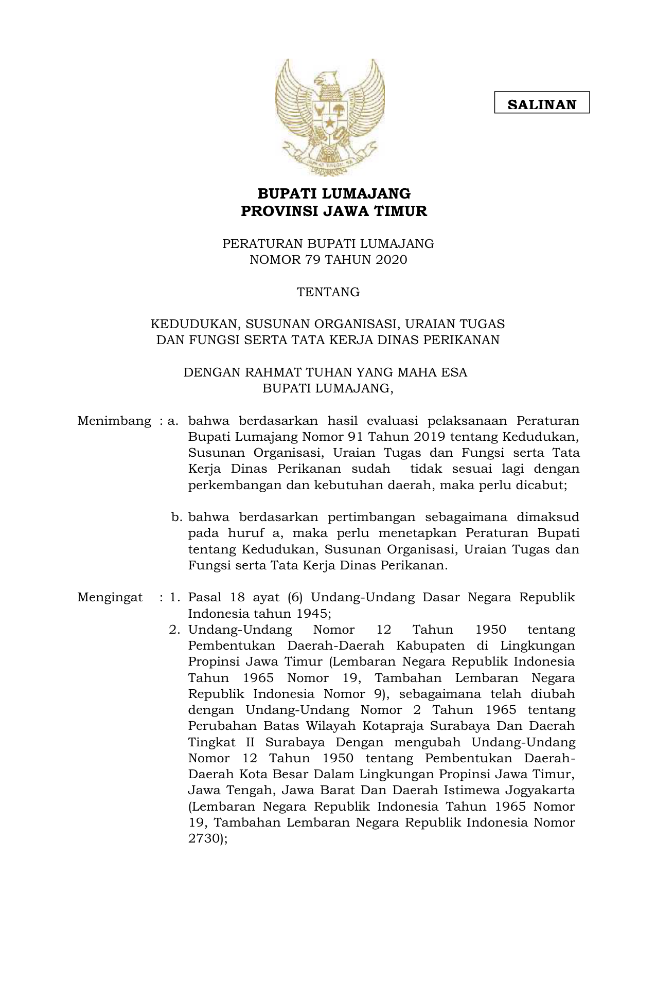 PERDA Nomor 79 Tahun 2020 | Peraturan Daerah Nomor 79 Tahun 2020 tentang KEDUDUKAN, SUSUNAN ORGANISASI, URAIAN TUGASDAN FUNGSI SERTA TATA KERJA DINAS PERIKANAN