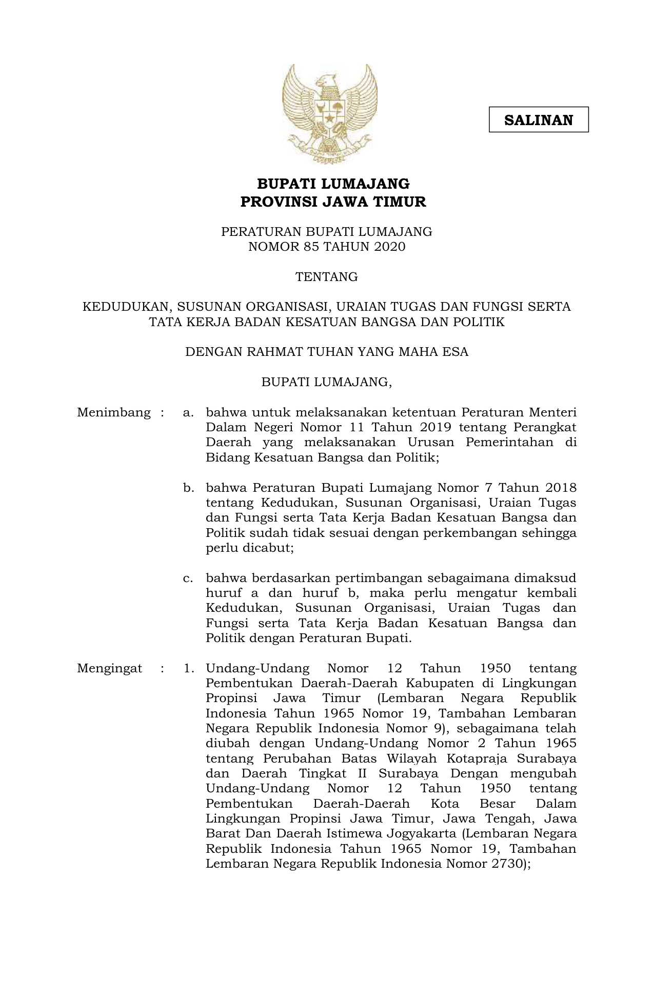 PERDA Nomor 85 Tahun 2020 | Peraturan Daerah Nomor 85 Tahun 2020 tentang KEDUDUKAN, SUSUNAN ORGANISASI, URAIAN TUGAS DAN FUNGSI SERTATATA KERJA BADAN KESATUAN BANGSA DAN POLITIK